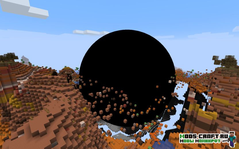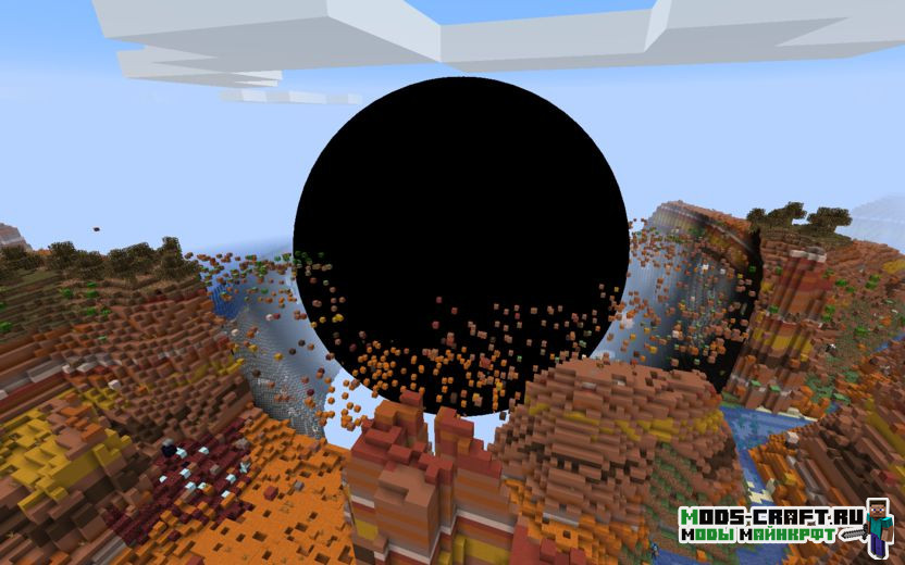 Данный мод добавит черную дыру в ваш мир Майнкрафт. Она будет поглощать все блоки вокруг себя, становясь всё больше и больше с течением времени, влияя тем самым на гравитацию и следуя за игроком.