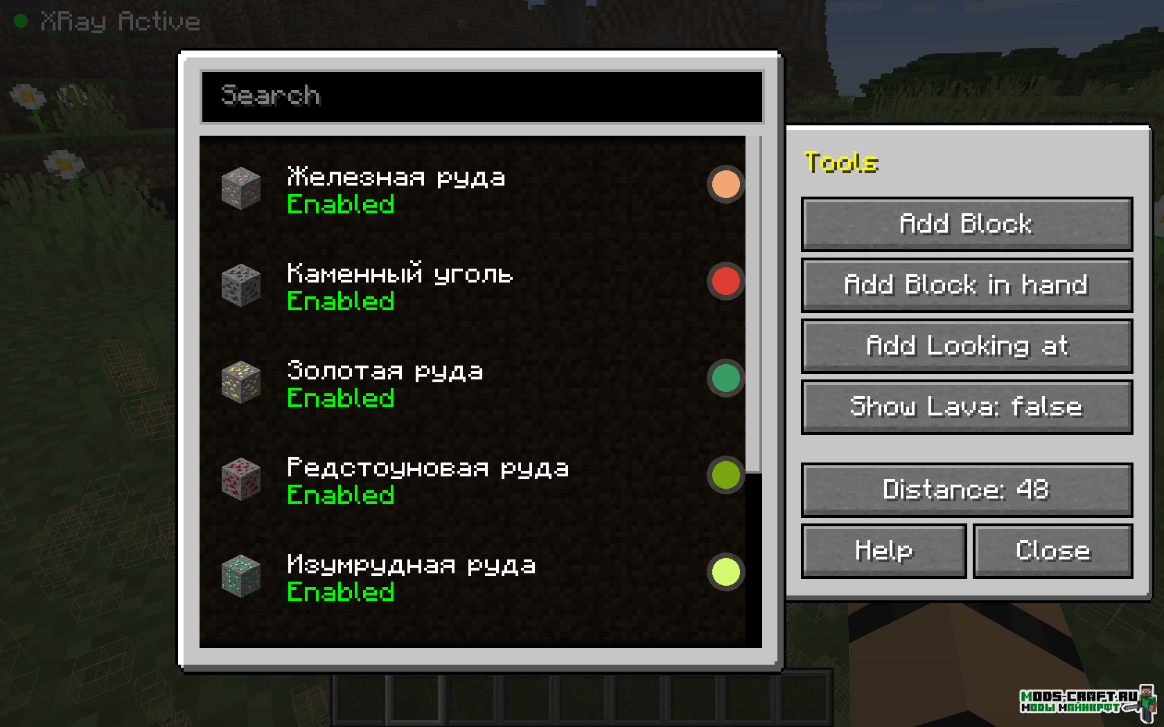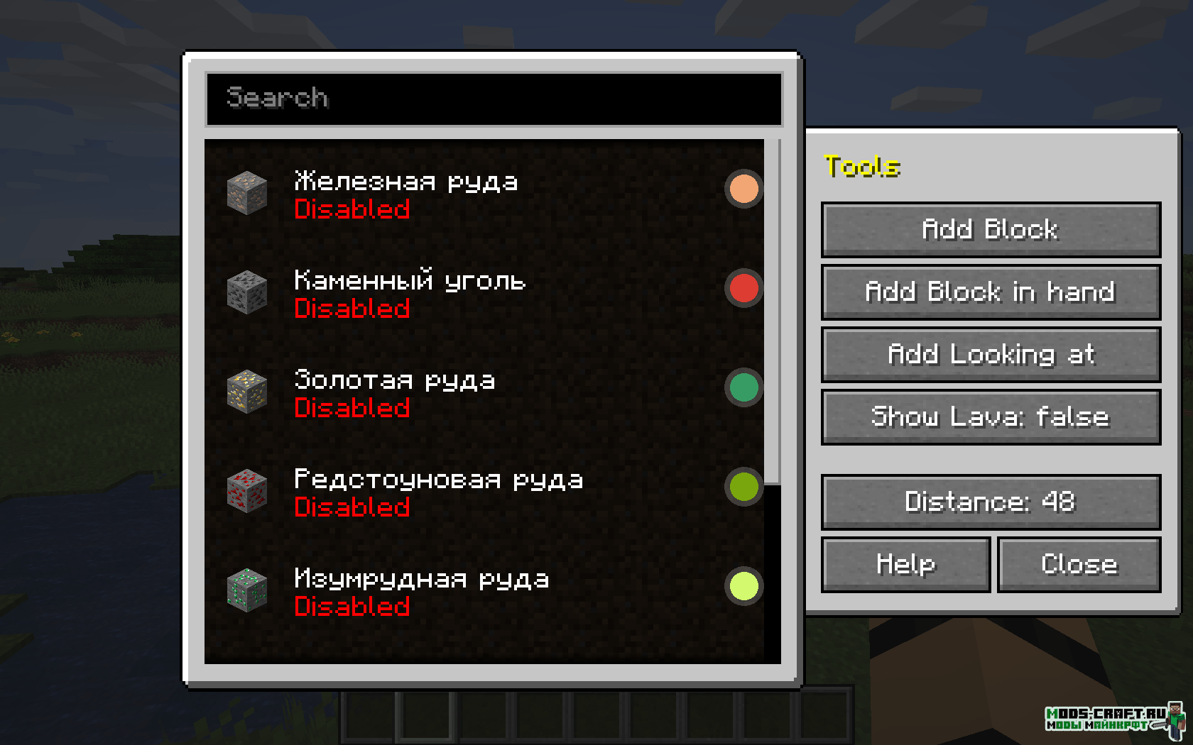 Кроме того, опционально через меню вы сможете включить отображение лавы и настроить дистанцию (в блоках) подсветки нужных блоков.