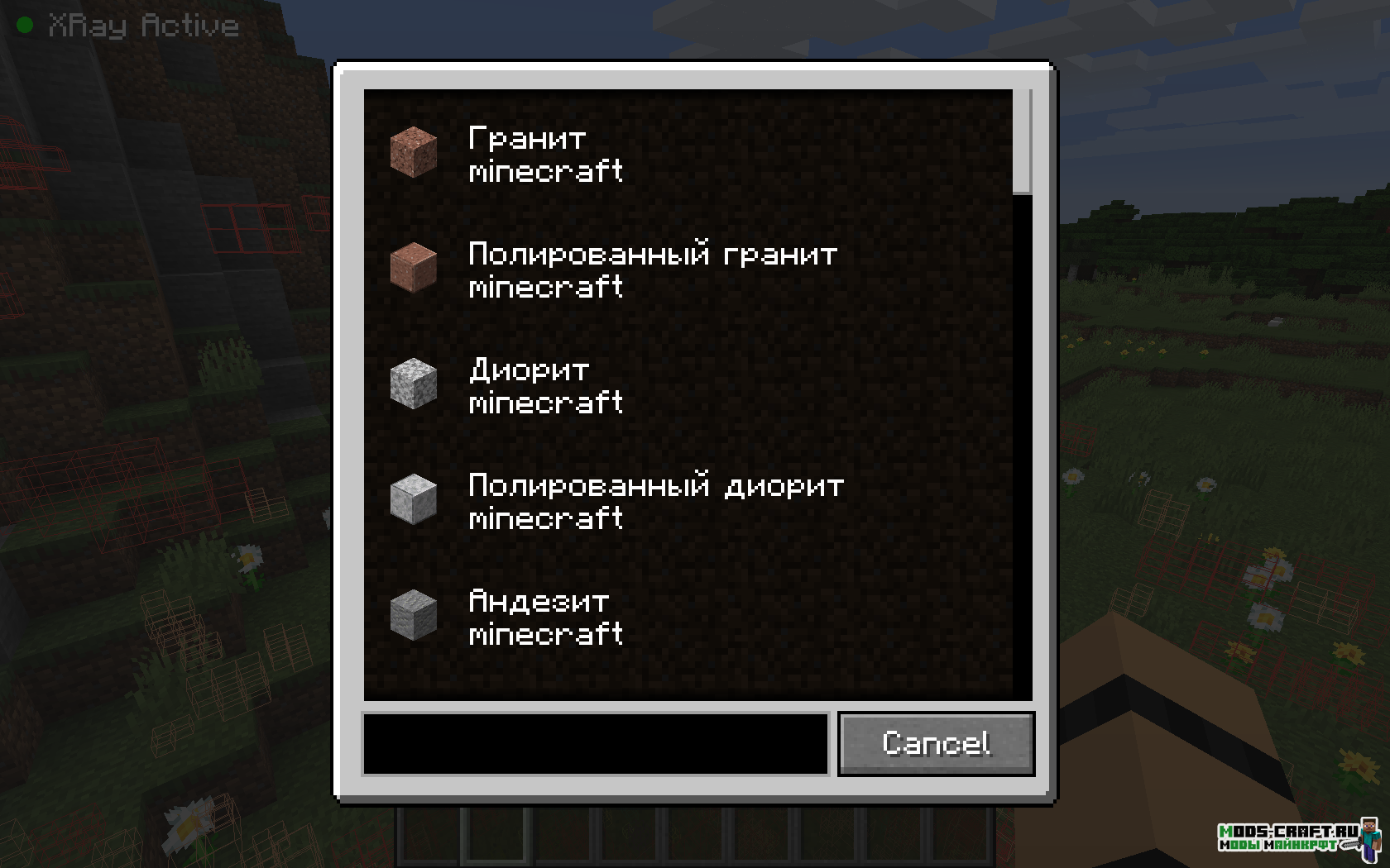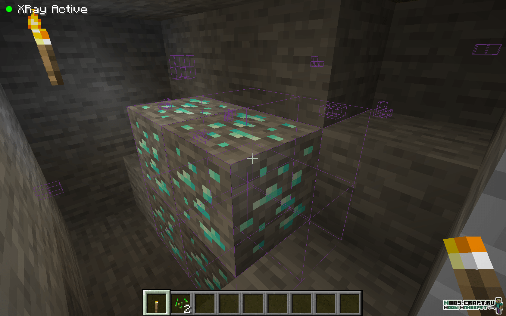 Advanced XRay — это ещё одна неплохая альтернатива известного чита Xray для Майнкрафт, который позволяет быстро искать ценные руды сквозь другие блоки. В данной версии мод не делает блоки прозрачными, а добавит цветную подсветку нужного блока. При помощи Advanced XRay даже можно выбрать любой блок для подсветки, даже из других модификаций, что довольно удобно.