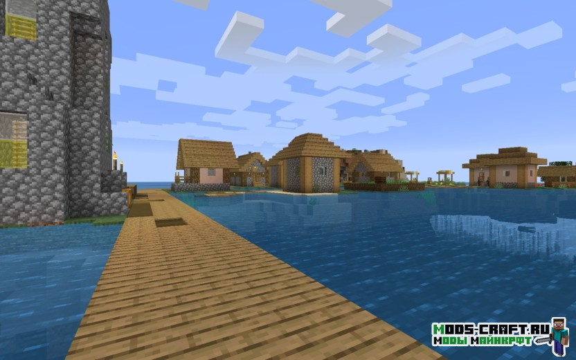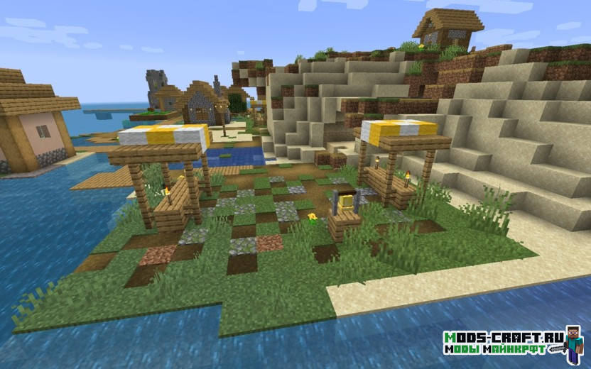 Редкий сид, который генерирует деревню на небольшом острове посреди бескрайнего океана. Рядом есть данж стражей и затонувший корабль — отличный старт для развития выживания.