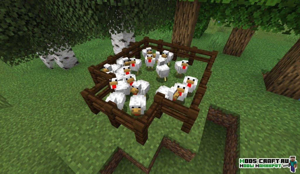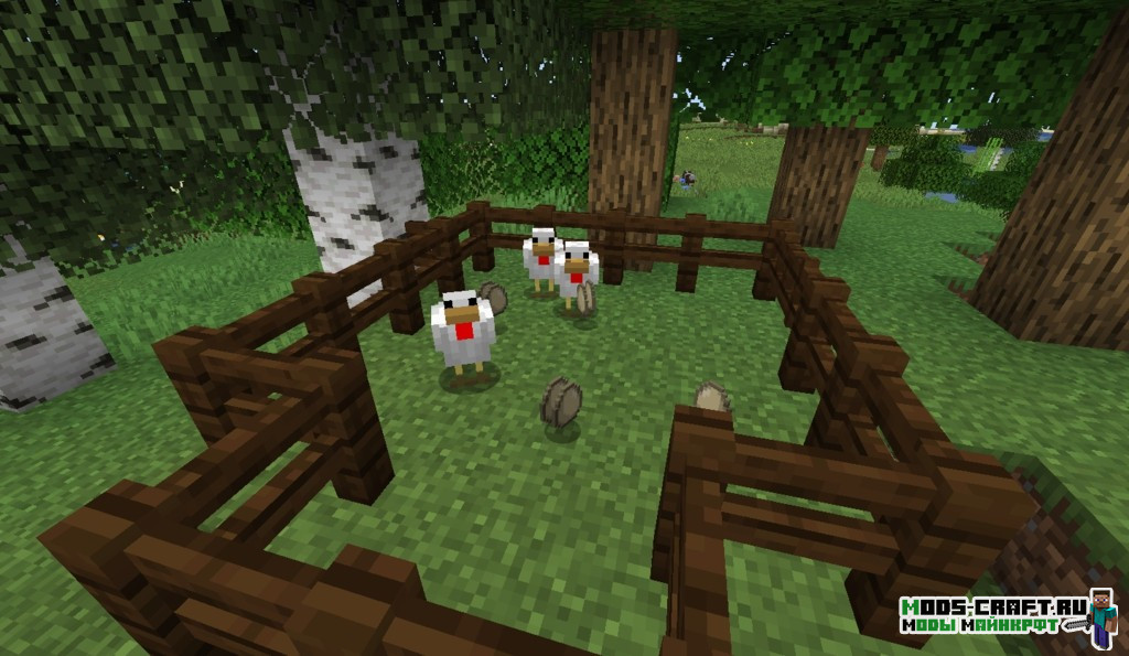 Минималистичный мод, позволяющий вылупляться цыплятам из валяющихся и исчезающих на земле куриных яиц. Чтобы не было бесконечного спавна цыплят, в радиусе 32 блока установлено ограничение на 50 цыплят. С помощью данного способа можно создавать автонаполняемые куриные фермы.