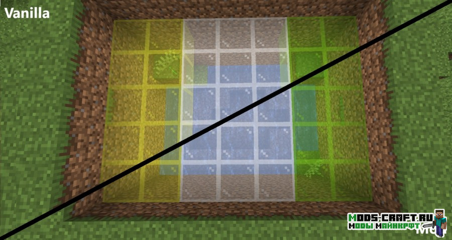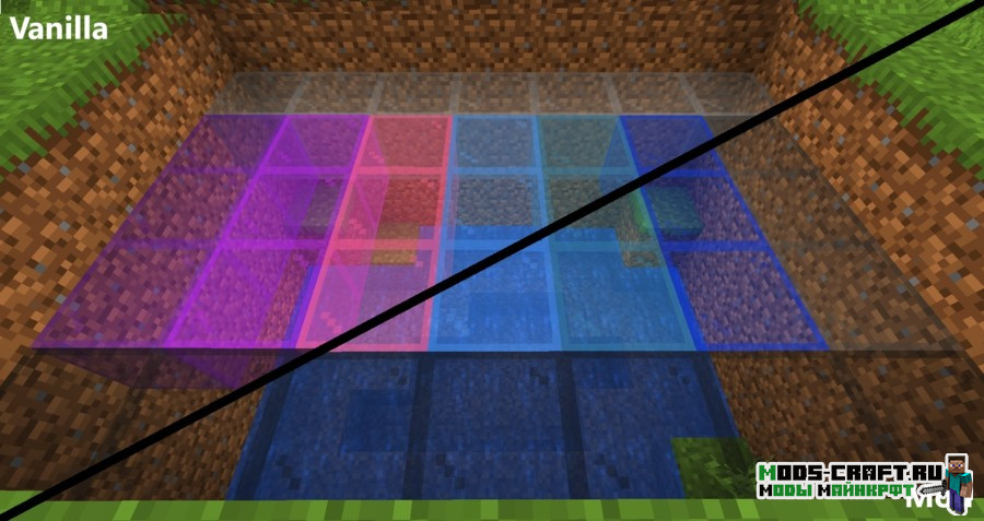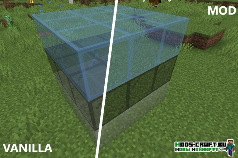 Ниже вы можете увидеть сравнение ванильной версии блоков стекла с блоками, изменёнными модом:
