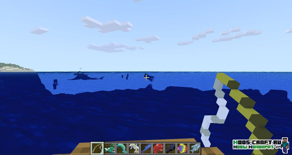 - Глубоководная рыбалка — это ловля рыбы при помощи новой удочки из этого мода, которая будет создаваться из железа и нитей. Для того чтобы ей воспользоваться, вам потребуется уплыть на лодке далеко от берега и забросить её, после чего вы сможете вылавливать редких и крайне полезных рыб, некоторых из которых даже можно использовать как корм для драконов