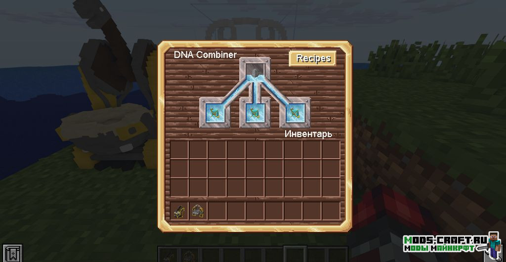 Далее создайте Железное яйцо из железных слитков, а так же Комбайнер ДНК. Внутрь комбайнера положите железное яйцо, а ниже сферы с ДНК тех драконов, которых вы хотите скрещивать и ожидайте результата. Список всех возможных комбинаций ДНК доступен в окне скрещивания при нажатии на «Recipes».