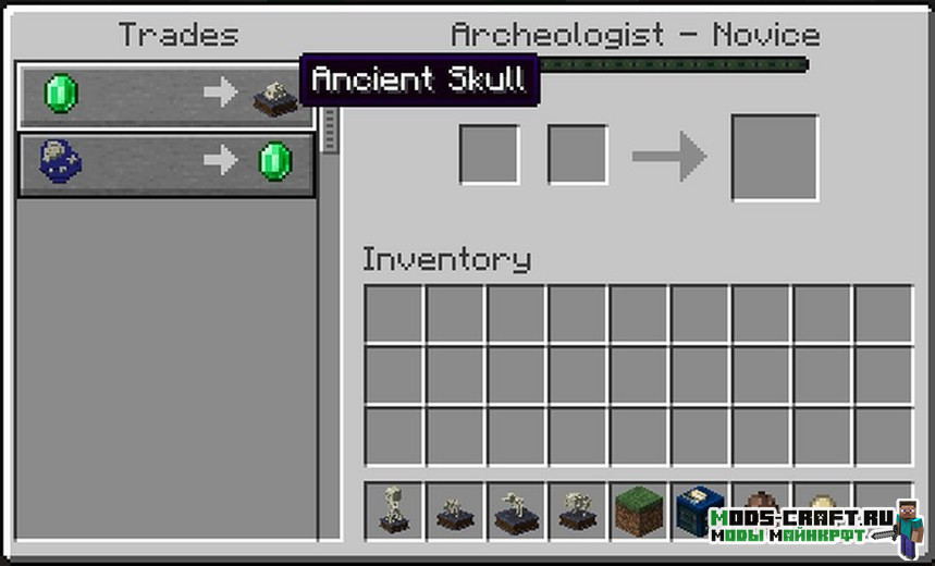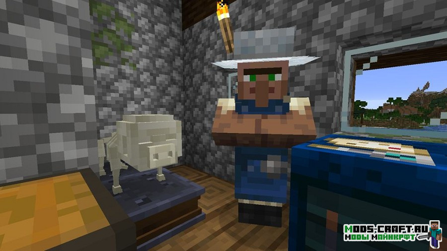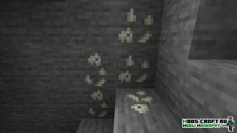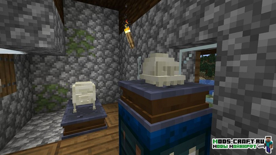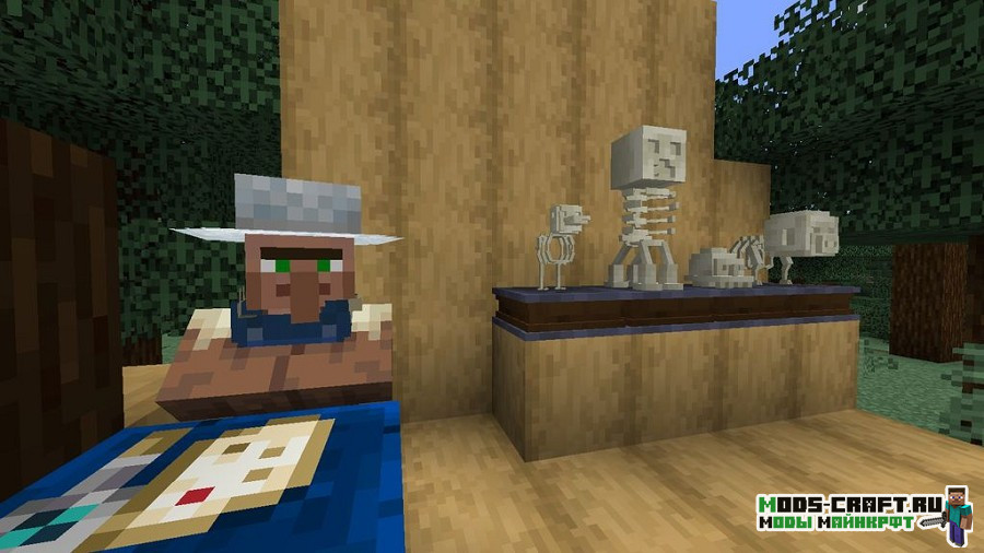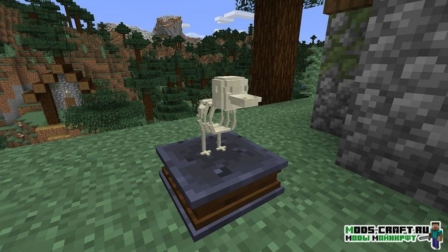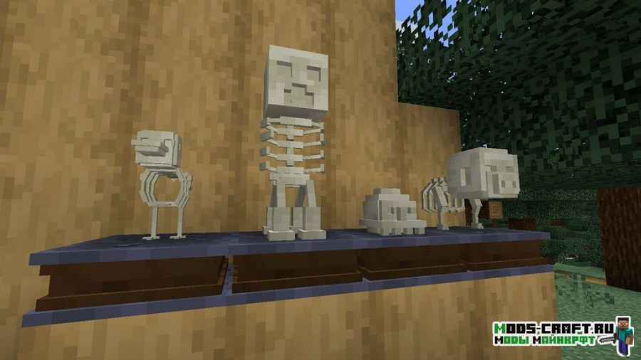Fossil — это модификация, которая добавляет новую руду в виде окаменелостей. В свою очередь её можно переработать в кости для дальнейшего использовании в декоре. Создайте специальный блок, порождающий нового моба — археолога. Он может обменять окаменелости на модели скелетов.