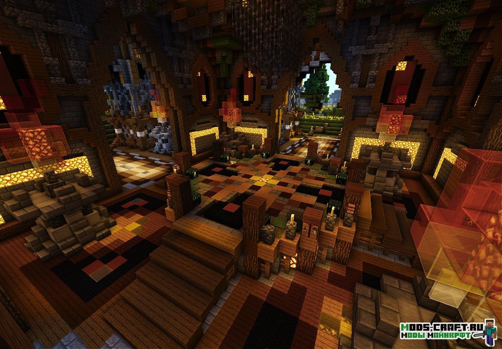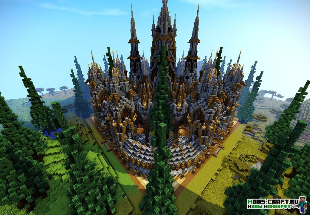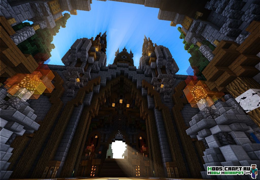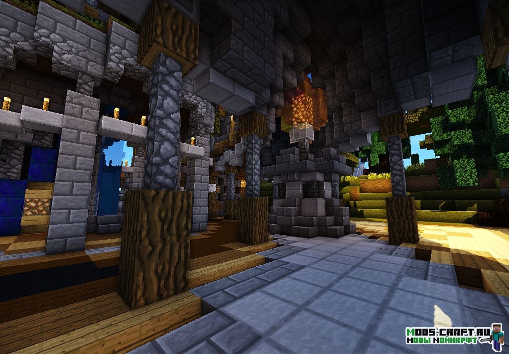 Очень красивый спавн для сервере в средневековом стиле замка с кучей различных комнат и украшающих штук. Снаружи построена высокая защитная стена, а в самой площаде прорастают деревья. Идеальный вариант для создателей серверов, где можно организовать различные магазины, команды или мероприятия. Площадь данного замка это всё вполне позволяет.