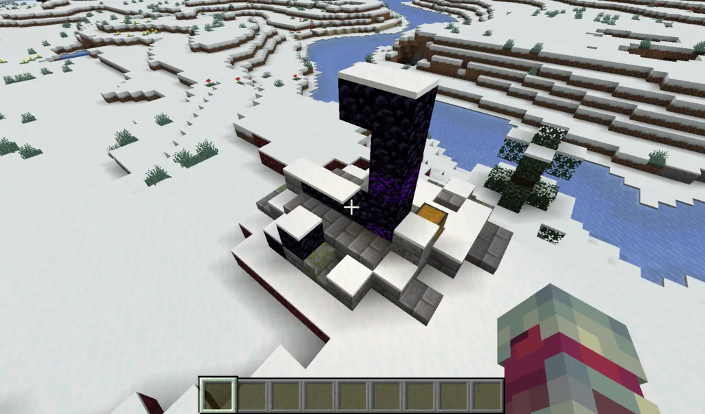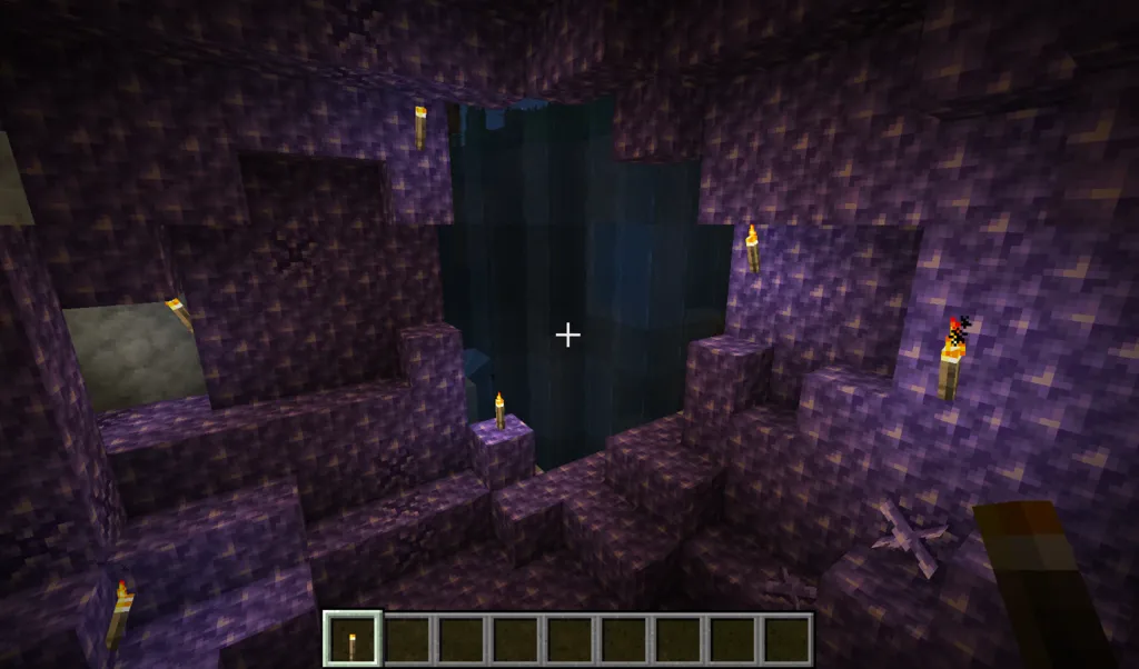 После появления вы увидите торчащий из моря гладкий базальт — это аметистовая жеода. Также вдали вы увидите иглу, но в ней, к сожалению, нет комнаты лечения зомби-жителя. Чуть дальше иглу находится разрушенный портал в нижний мир.