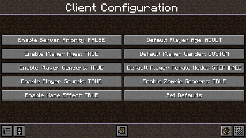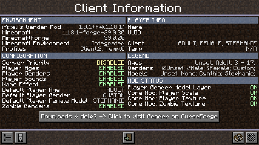 Мод для представительниц прекрасного пола добавляет возможность выбора пола игрока, а также включает настройки для мобов и добавляет детских персонажей. Главное меню мода открывается нажатием кнопки G.