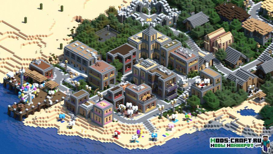 Огромный город под названием «Vertoak City» для майнкрафт 1.7.10 удивит вас своими размерами и огромными мегаполисами. Здесь есть всё: начиная от огромных портов у моря, фабриками, офисныхь строений и заканчивая зданиями мэрии и церквями. Я бы установил карту на свой сервер, чтобы игрокам было что изучать.