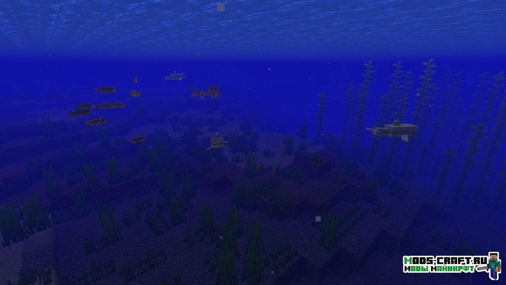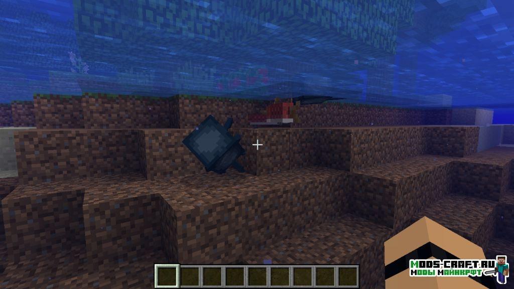 - Рыбы. Вообще, рыбы давно были в Майнкрафте, но были представлены исключительно в виде предметов. Их можно было ловить с помощью удочки и приготовить. В Морском обновлении они обрели воплощение в виде мобов, которые плавают в воде косяками. В зависимости от температуры воды (типа биома) в океанах водятся разные виды рыб. Ловить их можно всё также удочкой или… ведром.