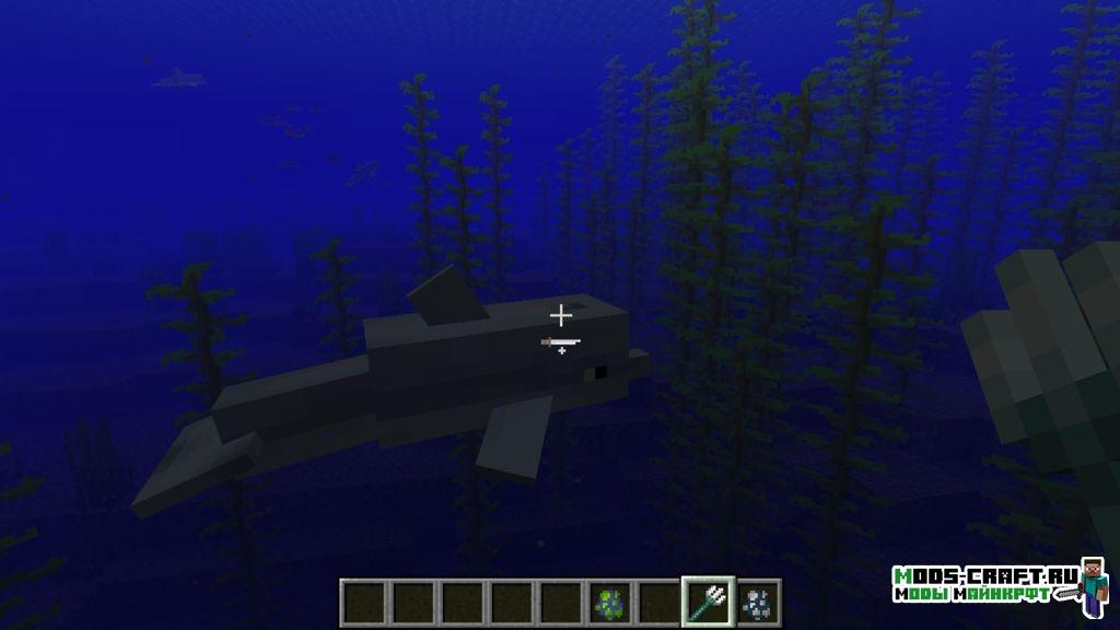 - Дельфин — нейтральный моб, который обитает в океанах. Если вы будете плыть на лодке, они будут плыть за вами и любят прыгать через препятствия над водой. При нахождении игрока рядом с ним, он получает ауру «Благодать Дельфина». Если покормить дельфина треской, то он сразу станет плыть к затонувшему кораблю или подводным руинам.