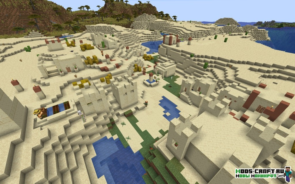 Очень хороший сид, где вы появляетесь около одной из деревень на небольшом острове. Поглядите назад, там есть ещё одна деревня в пустыне, а восточнее неё руины с сокровищами, храм в пустыне, а также подводные руины с алмазами. Также здесь есть два разбитых корабля с большим количеством ценных сокровищ. Я насчитал тут рядом около 4 деревень, вам будет что изучить.