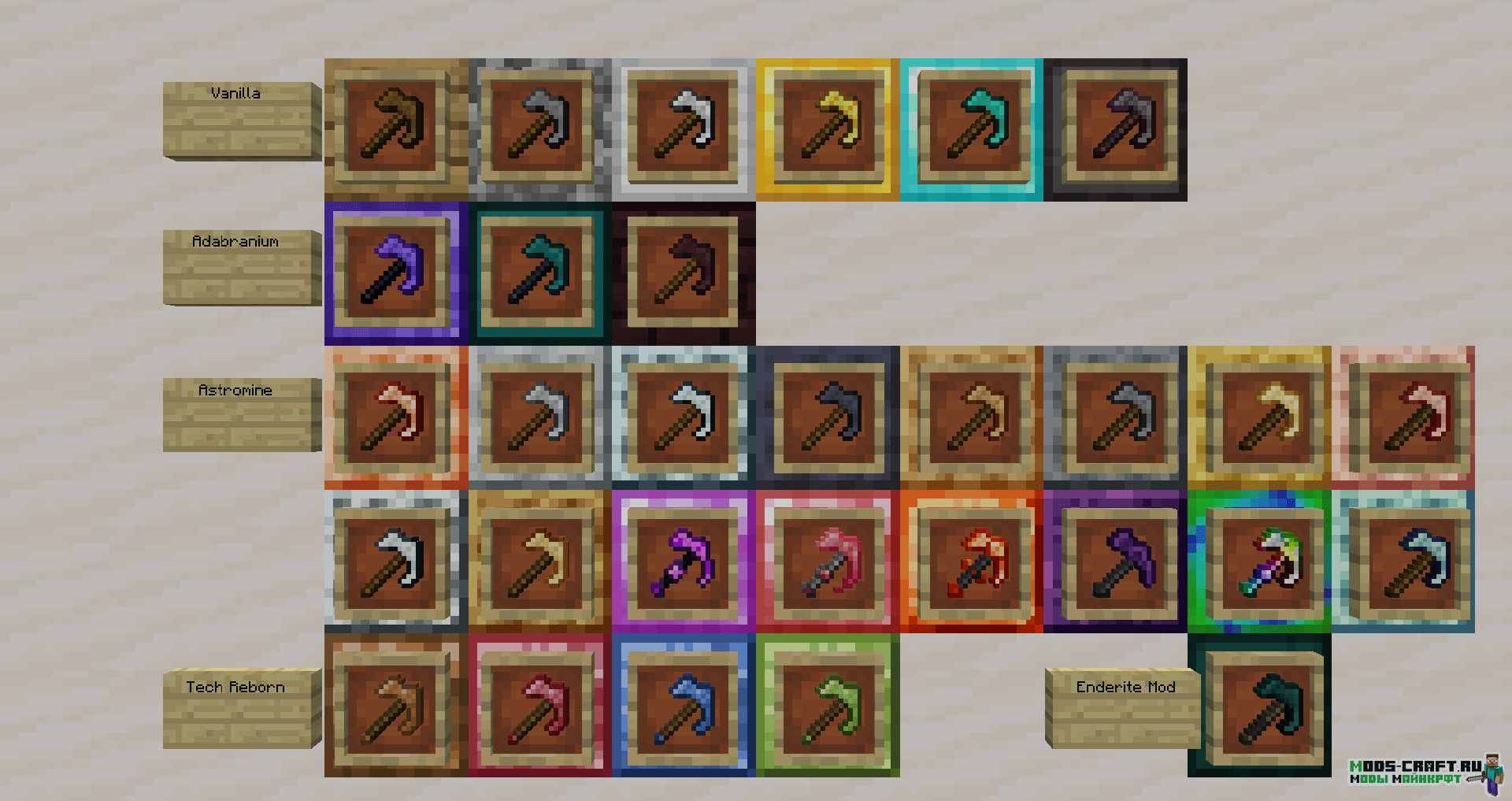 Мод AdaPaxels добавляет универсальный инструмент, объединяющий в себе функции кирки, топора, лопаты и мотыги. С помощью него вы можете создавать дорожки, чистить деревья от коры и обрабатывать кирпичи. Также инструмент обладает большой прочностью, например, AdaPaxels из железа будет иметь прочность 250 единиц, когда алмазный вариант целых 750.