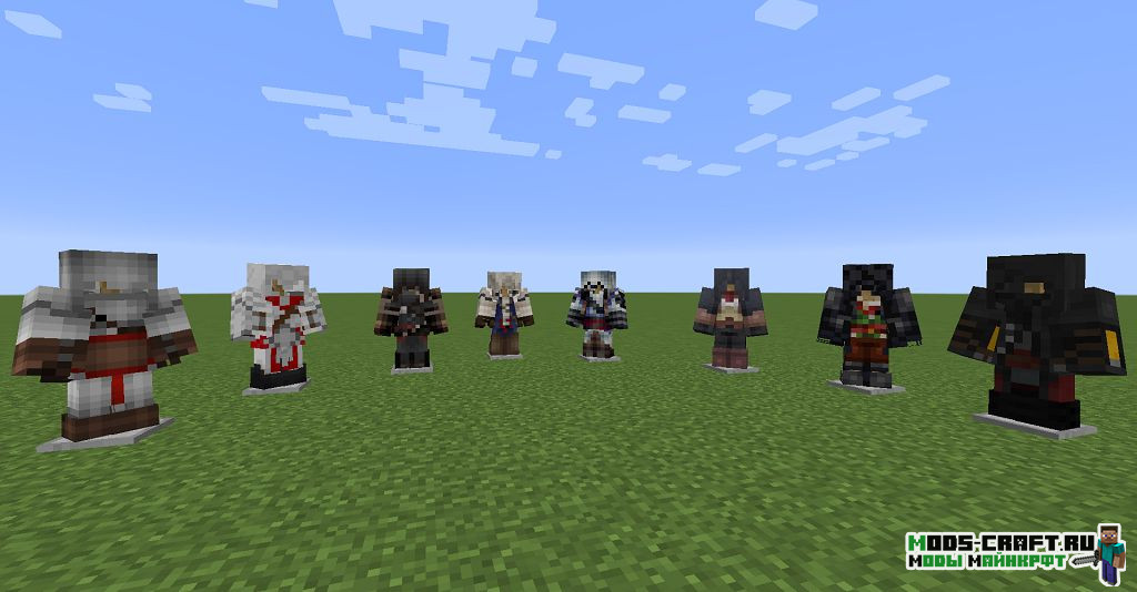 Данный мод посвящён серии игр Assassin’s Creed и добавляет множество контента в виде новых блоков, брони, оружия, способностей и уникальных механик в Майнкрафт! Вы сможете использовать легендарное орлиное зрение и мгновенное убийство при помощи скрытного клинка. Для прыжка веры может быть использовано сено, как в оригинальной игре. Также вам могут попасться лагера тамплиеров, которые нападут на игрока при его обнаружении.
