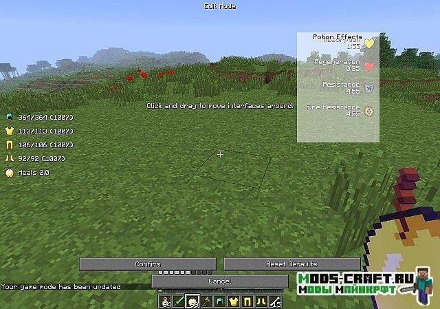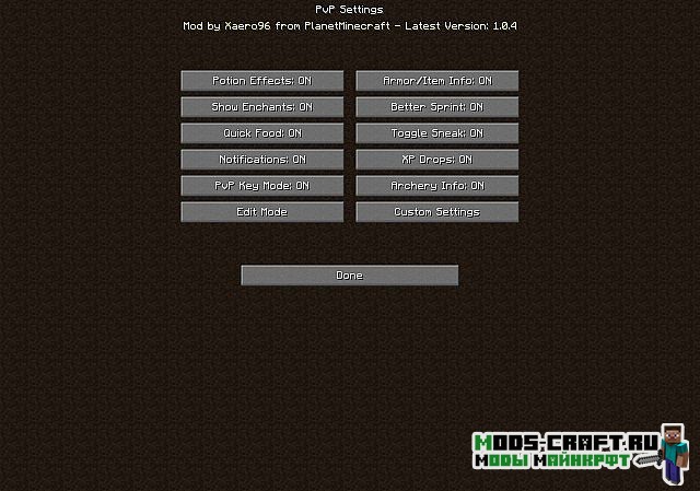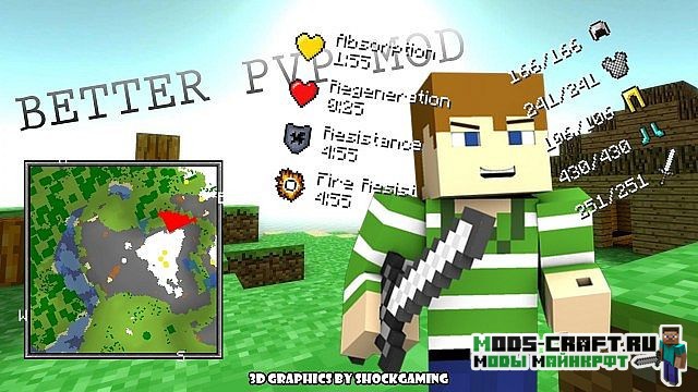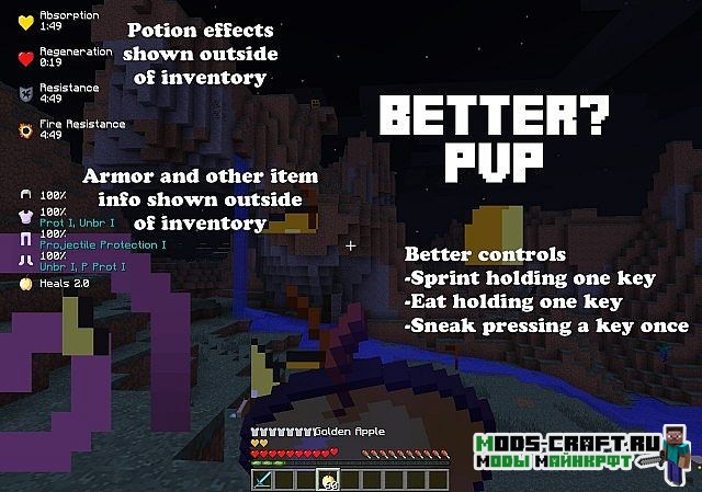 Мод Better PvP добавляет несколько полезных функций, которые будут полезны как в PVP-сражениях, так и в обычном выживании. При помощи удобной системы, вы сможете самостоятельно настроить расположение элементов на экране игры: миникарта, статус брони, статус зелий, здоровье противника и входящий урон по нему.