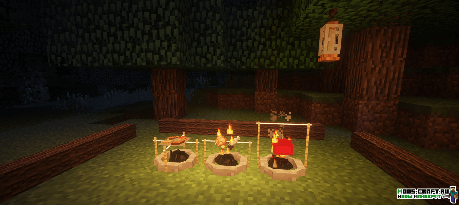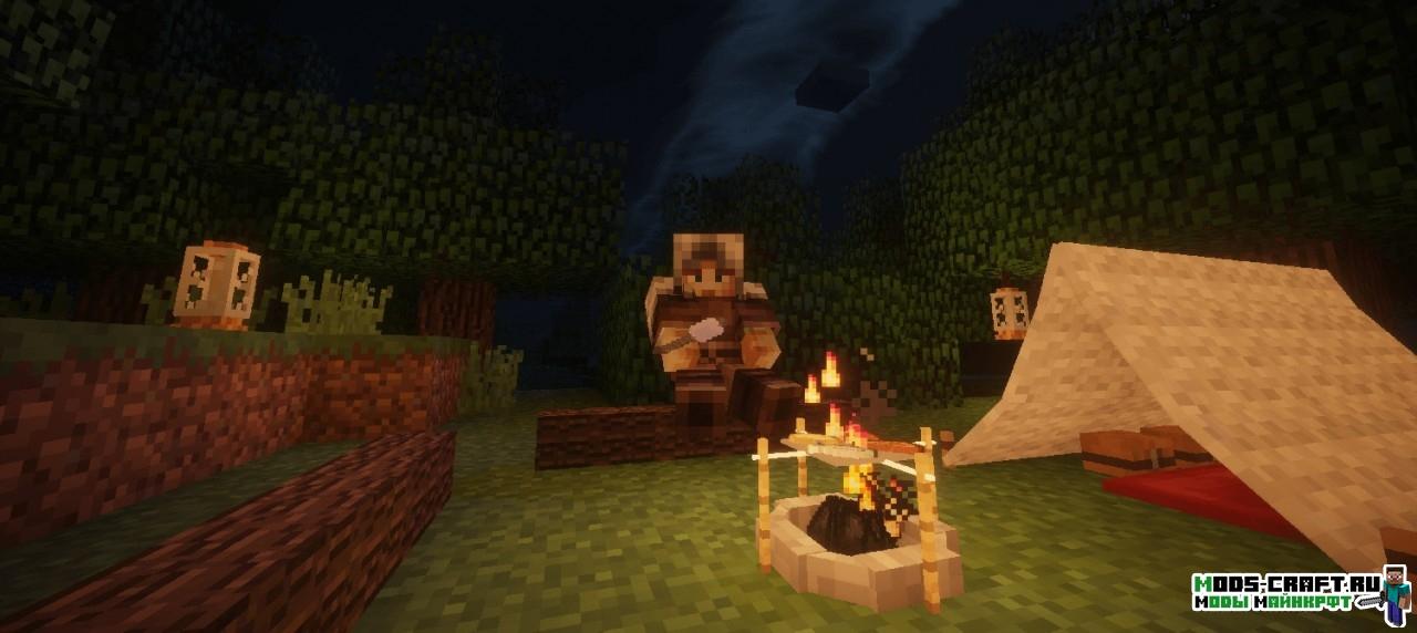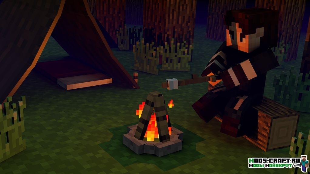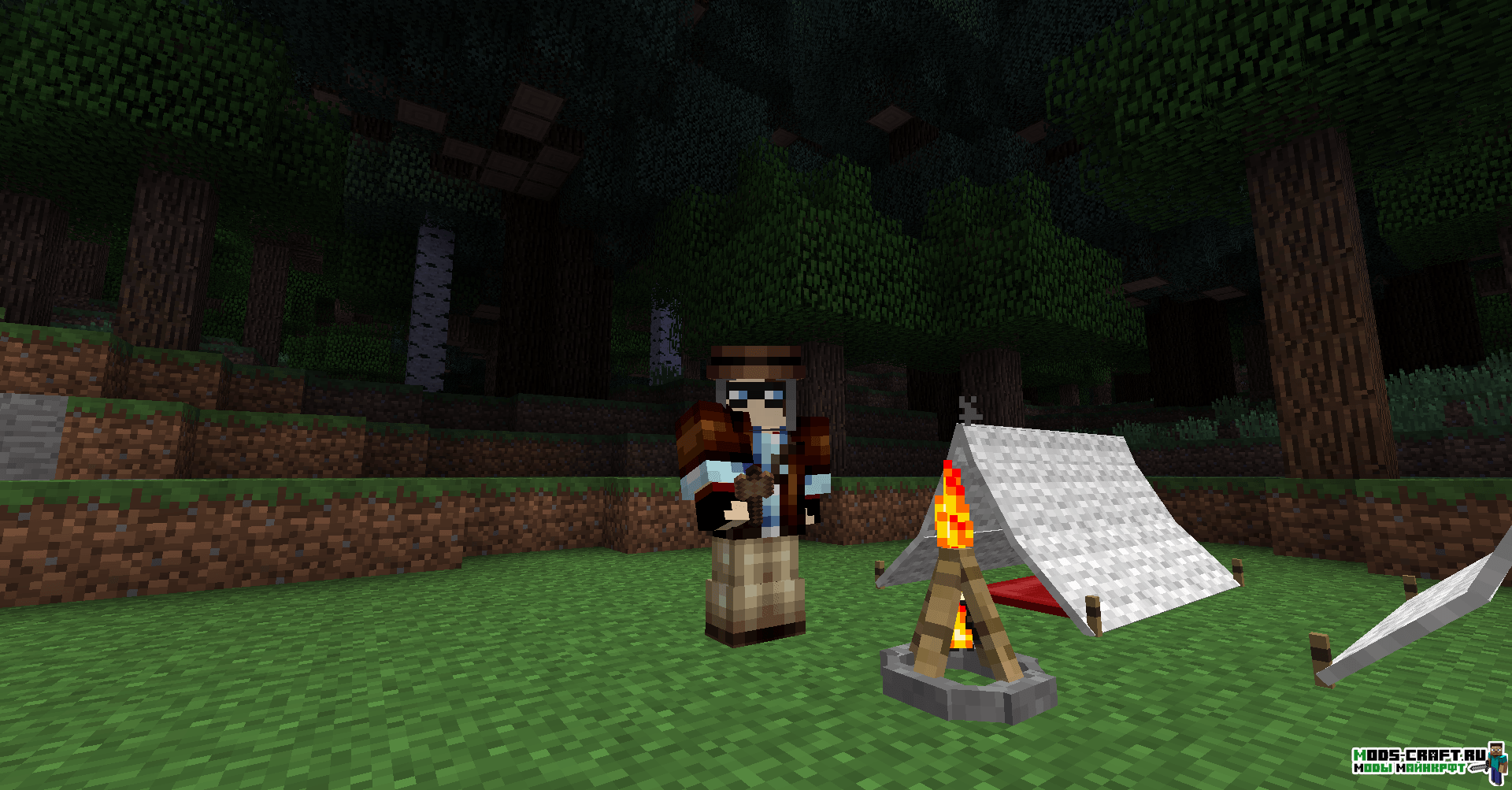 Мод Camping позволяет Вам создать свой собственный полевой лагерь: стройте палатки, разводите костры и делайте себе место для отдыха. В игре появятся новые животные, вроде медведей из которых можно добывать себе шкуру и мясо. Вы станете самым настоящим туристом с неплохим арсеналом нового инвентаря для выживания в дикой природе.