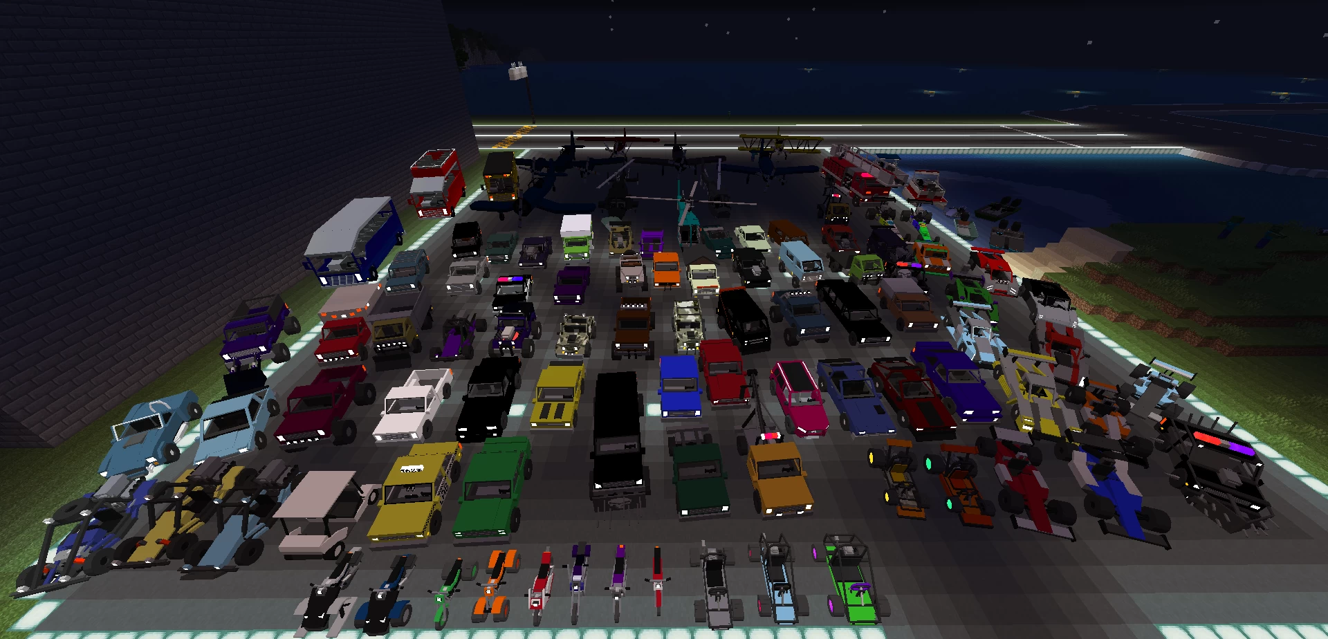 Мод добавит большое количество различного транспорта в игру Майнкрафт. На данный момент существует: 6 самолётов, 3 вертолёта, 34 легковых автомобилей, 13 грузовиков, 3 фургона, 4 джипа, 3 внедорожника, 5 прицепов, 1 машина для гольфа, 1 снегоход, 3 автобуса, 4 багги и многое другое. Все машины обладают простейшими текстурами и вы можете ездить на них куда захотите по миру игры.