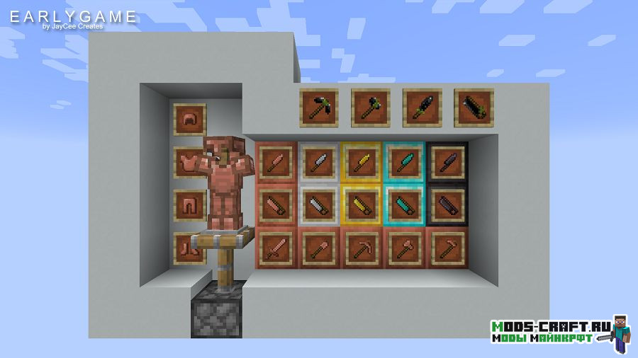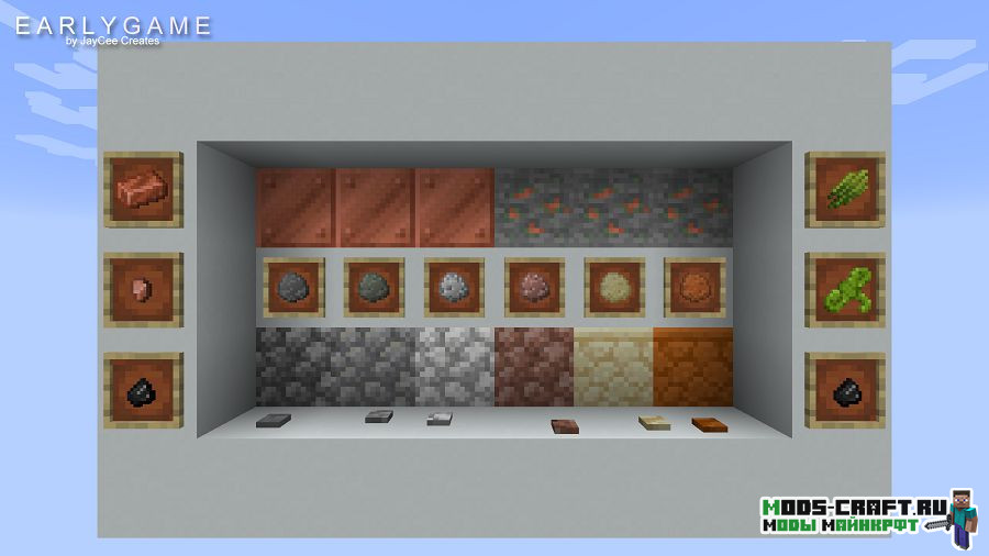 EarlyGame — мод для Fabric, акцентирующий внимание на изменении ранних игровых аспектов, чтобы сделать игру более «реалистичной». Теперь вы не сможете добывать дерево голыми руками, а для создания первых простых инструментов необходимо собирать палки и камни, валяющиеся на земле.