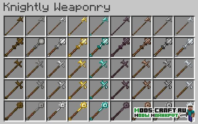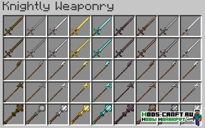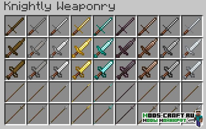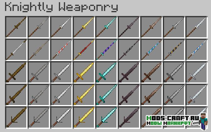Данный мод заставит вас почувствовать настоящим рыцарем! Ведь он добавит 7 сетов брони и 18 видов оружия в стиле средневековья, которые могут быть изготовлены как из ванильных, так и из новых материалов (сталь).
