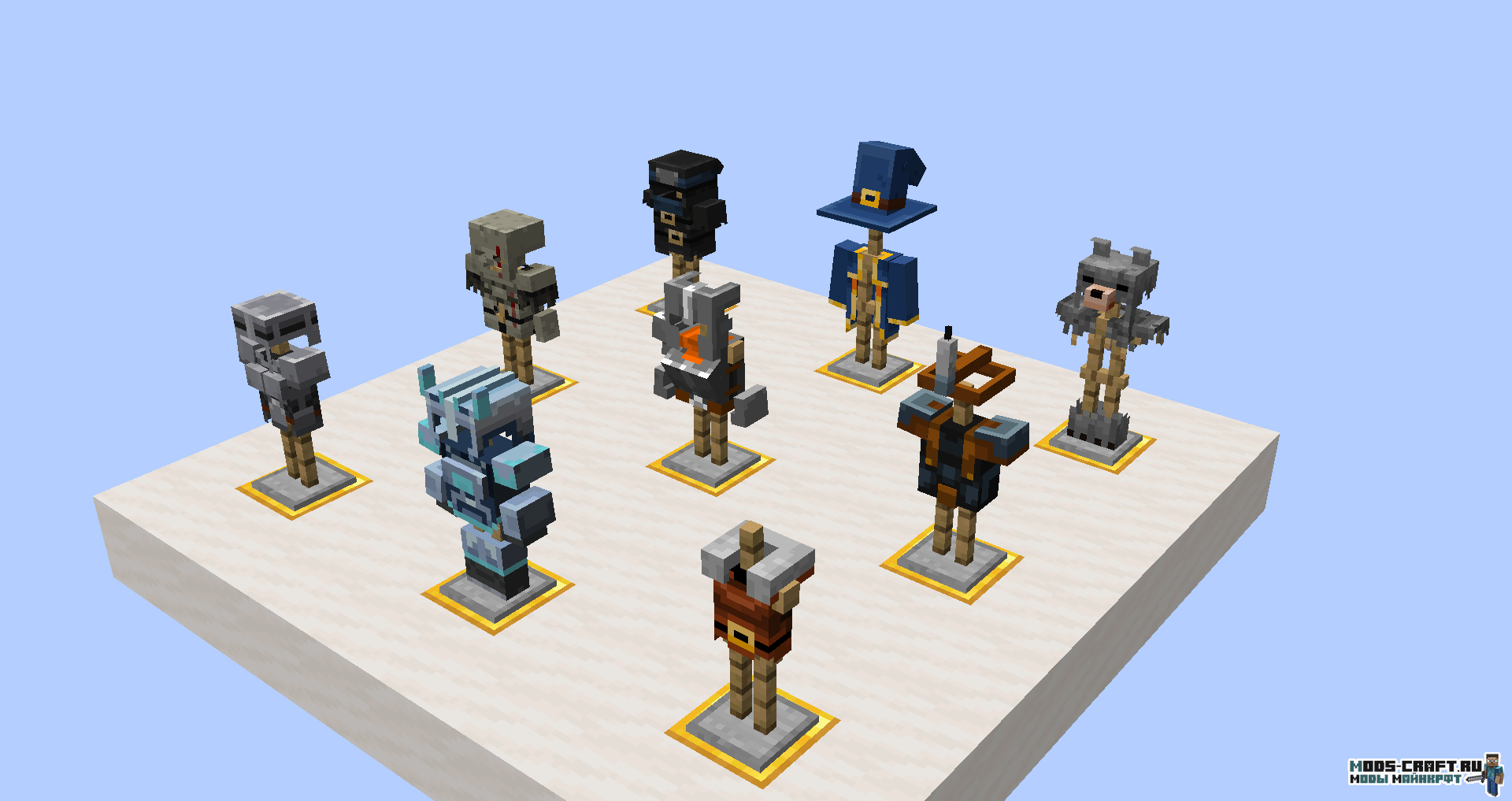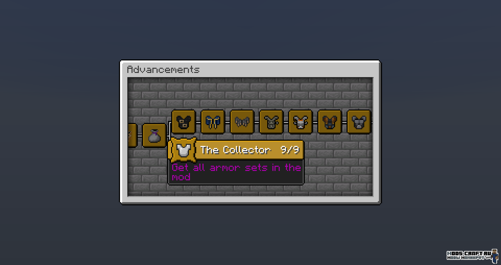 Feder’s Dungeon Armors добавит 8 сетов брони из игры Minecraft: Dungeons, которые могут быть найдены в специальные броневых мешках с фиолетовой веревкой — они размещены в подземельях и структурах. При сборе всех сетов брони вы получите достижение «Коллекционер».