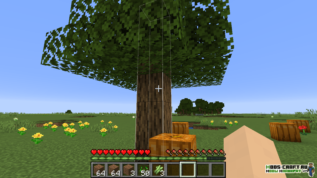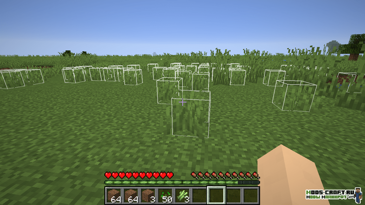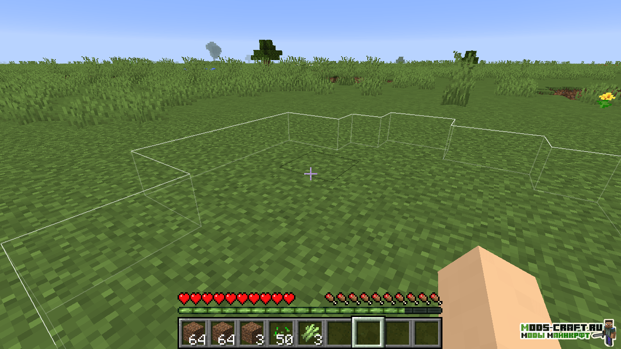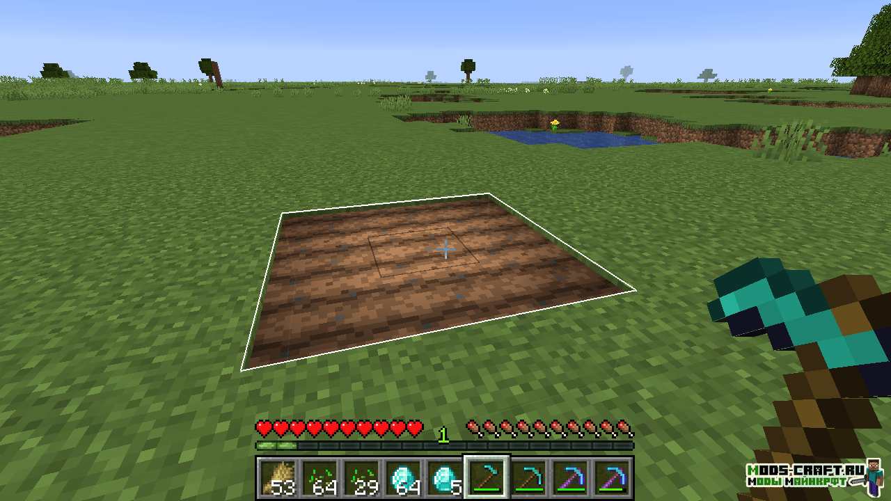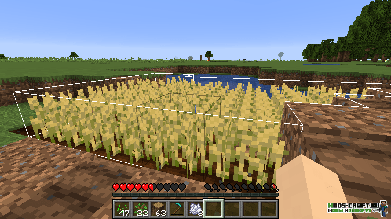 Мод позволяет одновременно вспахивать, засаживать и собирать урожай сразу на нескольких блоках. Удерживайте клавишу «Ё» для выделения нужного количества блоков (в версии 1.15.2 они будут выделены белой линией).