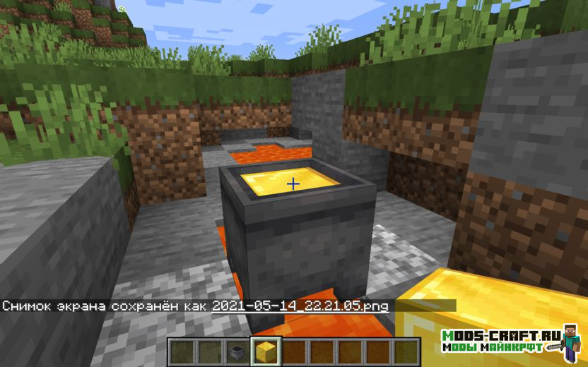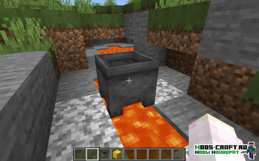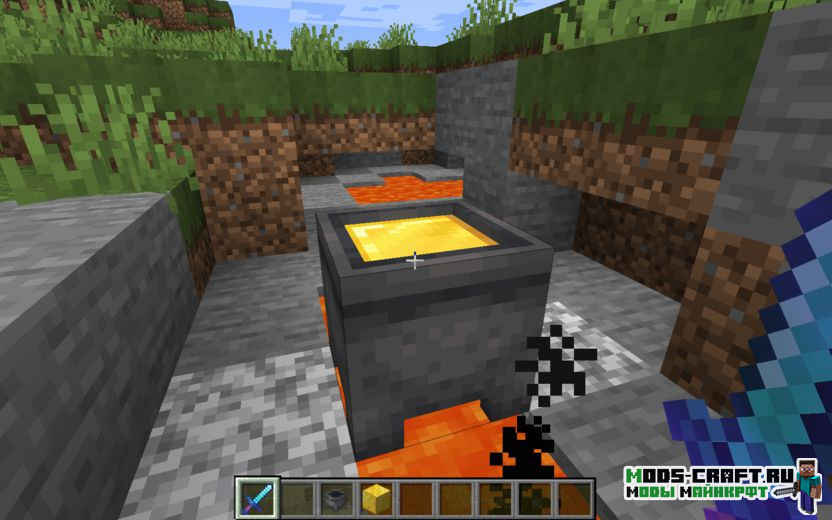 - Положите золотой блок на поверхность котла. Он исчезнет, и котел будет содержать расплавленное золото.