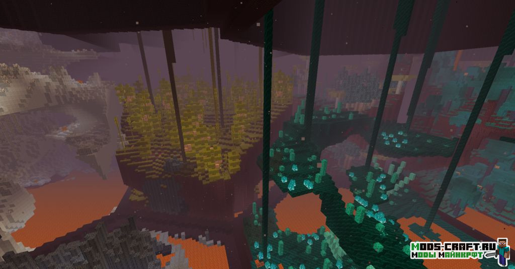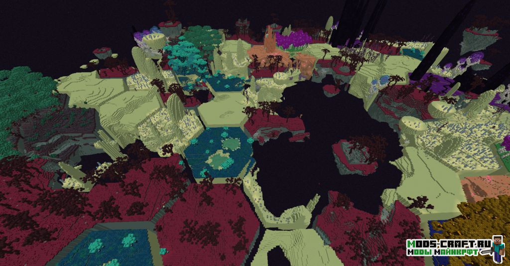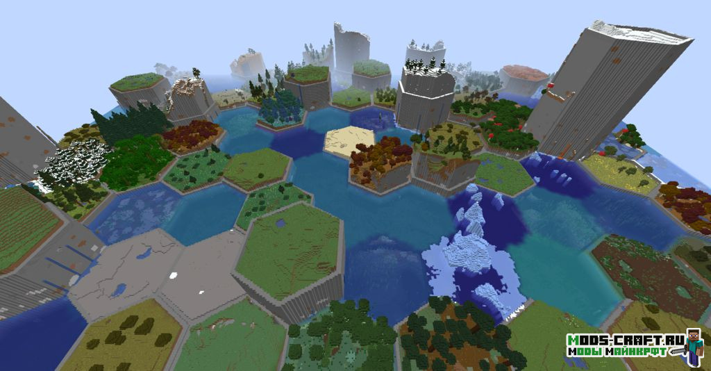HexLands II добавит 2 новых варианта генерации мира: «HexLands» и «HexLands (Overworld)«. Первый позволяет сгенерировать местность из шестиугольников в верхнем и нижнем мирах, а второй только в верхнем мире. Каждый шестиугольник содержит один биом, включая биомы из модов.