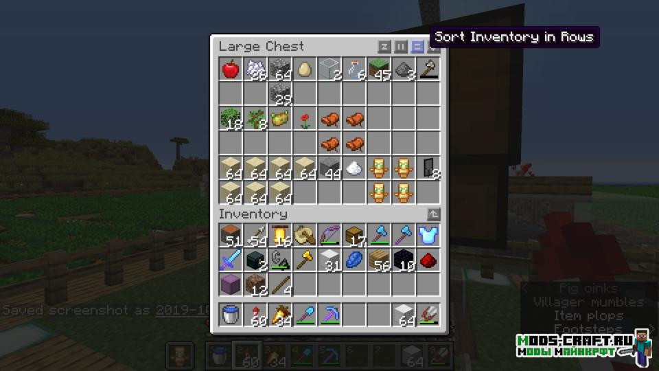 Inventory Profiles — это полезный мод, который поможет вам отсортировать инвентарь или сундук. Для осуществления этих целей вам будут доступны специальные клавиши, интерфейс с описанием этих клавиш вы сможете открыть с помощью одновременного зажатия R + C. Простая сортировка осуществляется на клавишу R.