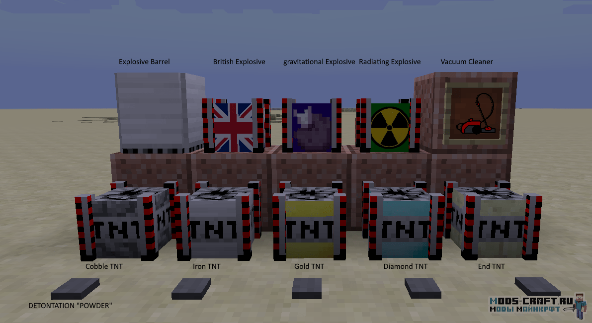 Мод Iron TNT привносит в Майнкрафт новые виды динамита и взрывчатых веществ. Причем вы можете повышать уровень взрывчатки для более мощного взрыва. Среди новых взрывчатых предметов можно выделить: гравитационные бомбы, динамит с дистанционным пультом управления, метательный динамит, бочки со взрывчатым веществом, тротил и C4, а также различные вспомогательные средства для дистанционных подрывов с таймером, ловушек и прочего. Также вы сможете возбудить взрыв при помощи попадания горящей стрелы из лука.