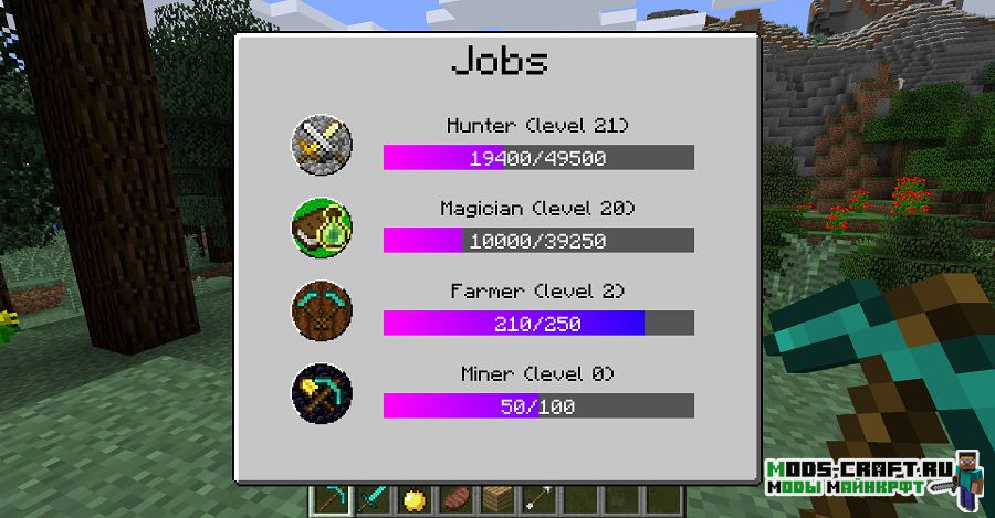 Jobs — это RPG-мод, добавляющий в игру 4 профессии: охотник, маг, фермер и шахтёр. Выполняя определённые действия для каждой профессии, игрок будет накапливать опыт и повышать свой уровень профессии. Переходя на следующий уровень профессии вы получите бонусы и открыть рецепты крафта. Нажав клавишу J, вы откроете меню заданий, в котором будет указано, на каком уровне вы находитесь и как получить опыт для каждой профессии.