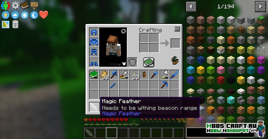 Magic Feather — полезный мод, добавляющий магическое перо, дающее игроку полёт как в творческом режиме в радиусе действия ванильного маяка. При помощи такого волшебного инструмента вы сможете воспользоваться полётом для удобного строительства или поразвлечься с друзьями.