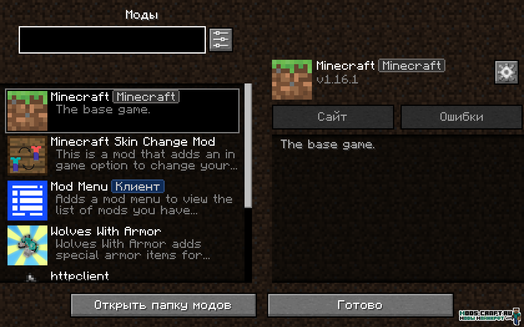 Простой и очень полезный мод для Fabric, позволяющий видеть список установленных модификаций в игре. В главном меню появится новый пункт меню с счётчиком установленных модов, если зайти в него, то можно увидеть полную информацию о каждой модификации: посетить её сайт, прочитать краткое описание и прочее. Здесь же можно выполнять настройки конфигураций и модов.