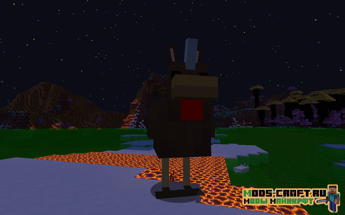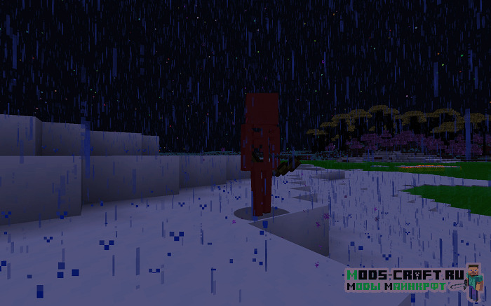 Оказавшись в новом мире мы можем увидеть отличительный ландшафт и новую цветовую гамму, растения, биомы и мобов. Последних кстати я вам сейчас продемонстрирую — это новый зомби, скелет, какой-то магический шар, каменный голем и водное существо. Примечательно ещё то, что некоторые мобы будут получать урон от дождя — продемонстрировал на последнем скриншоте как скелет умирает от дождя.