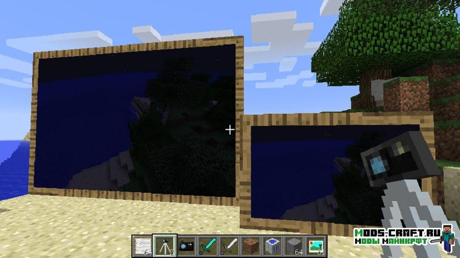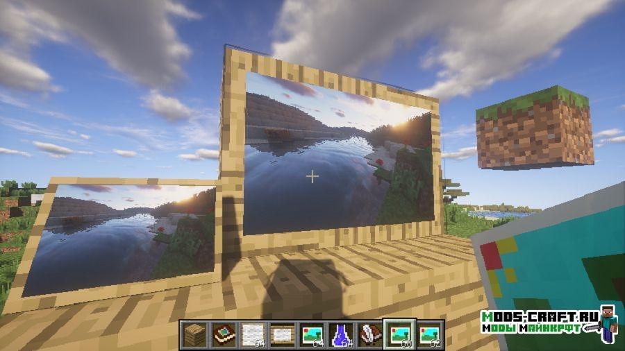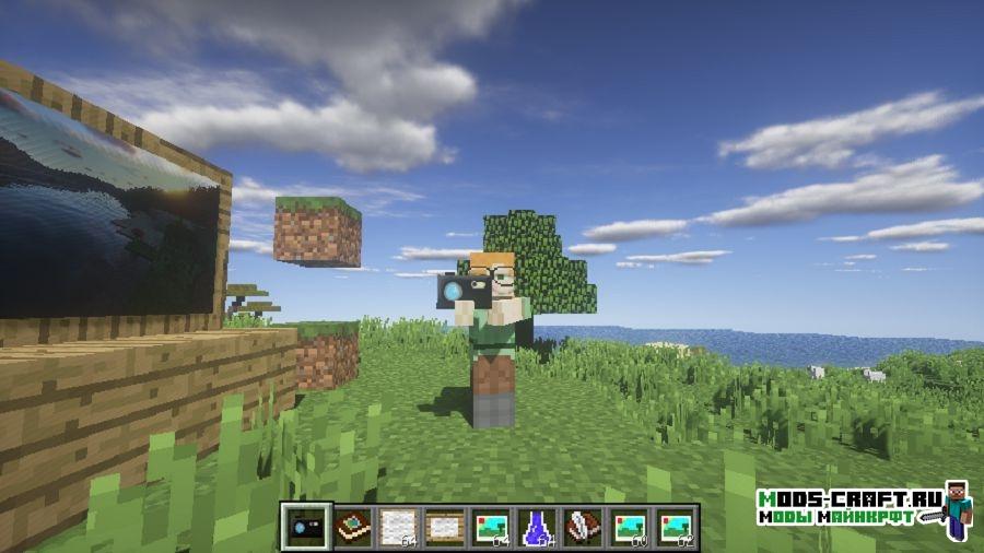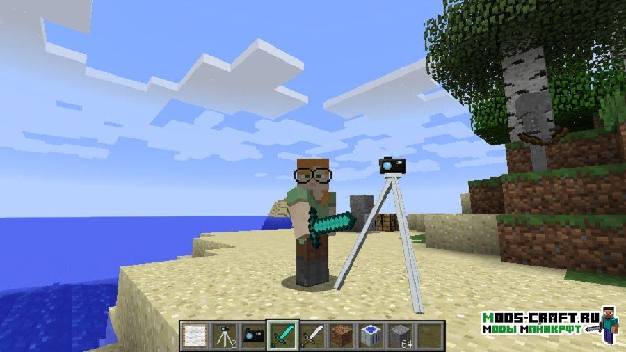 Мод Mine Camera добавит в Майнкрафт небольшую по размерам камеру, на которую можно делать снимки и записывать видео. Для этого можно даже скрафтить специальный штатив. Фотографии, сделанные с помощью новой аппаратуры, можно поместить в рамки на память.