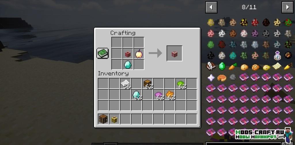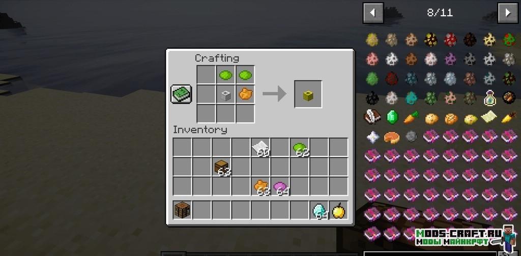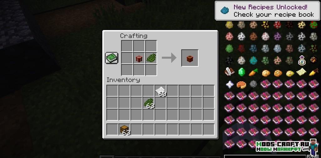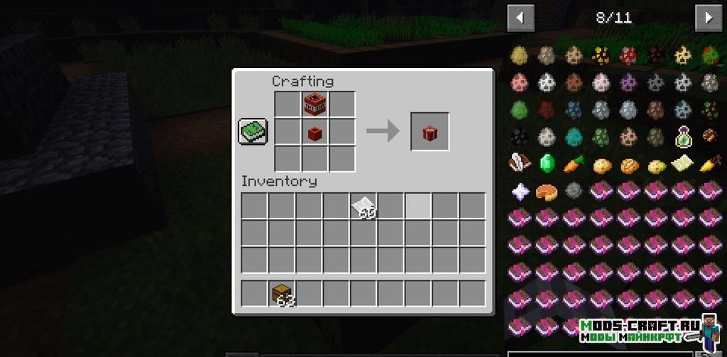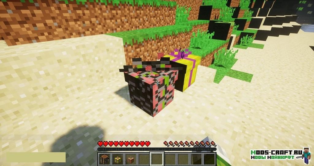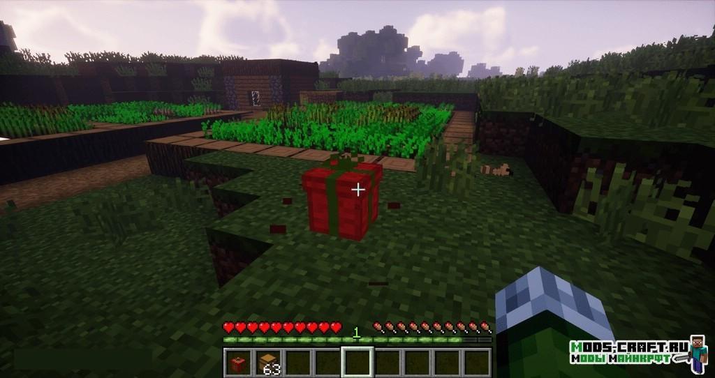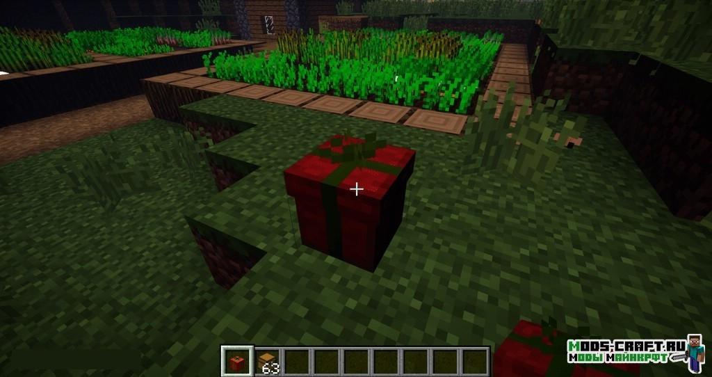 Кроме того, в снежном биоме под елями теперь случайно может появиться такой подарок со случайным содержимым, начиная от блоков земли, заканчивая алмазными блоками и зачарованным предметами.