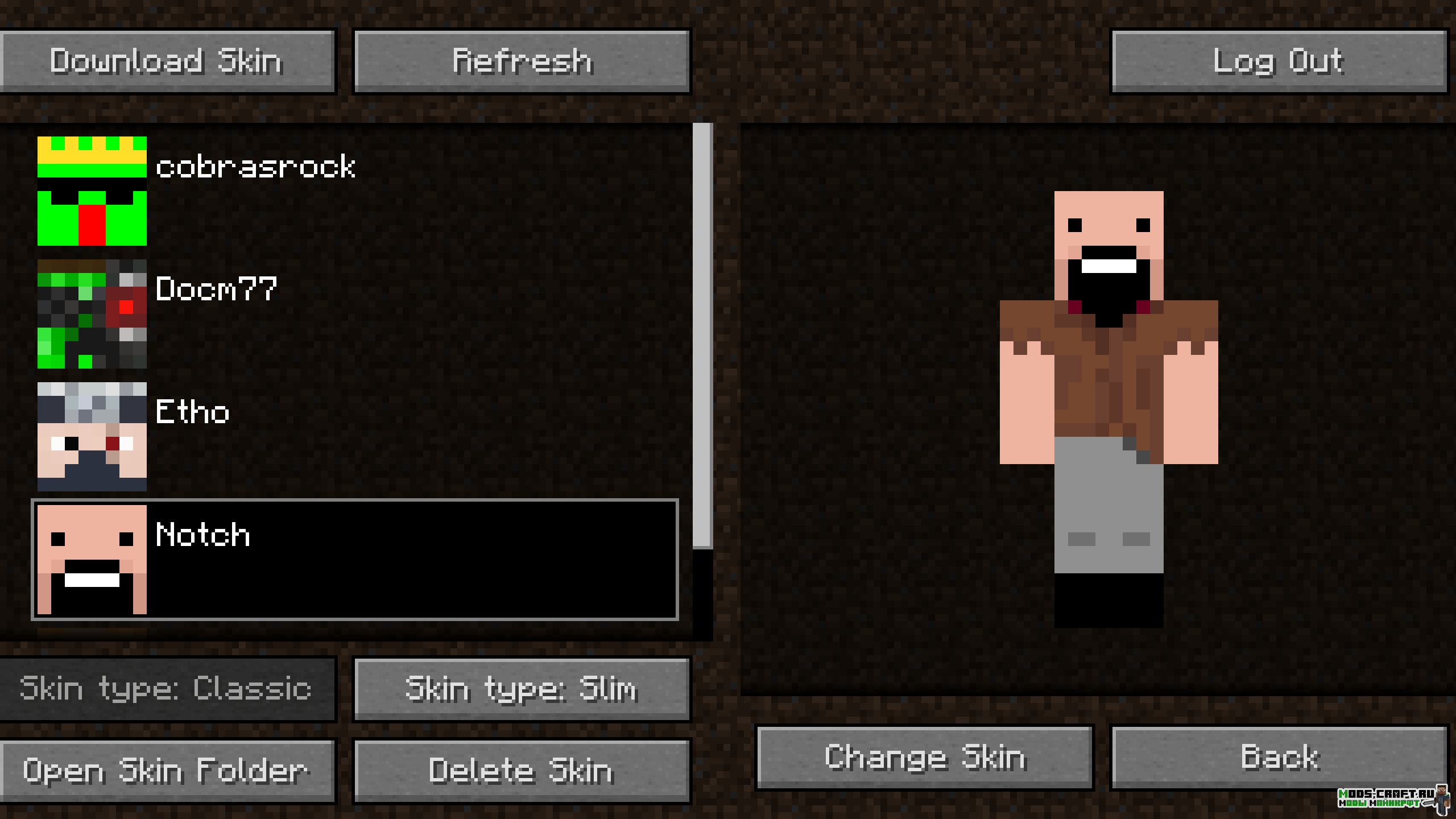 С помощью мода Skin Swapper вы сможете быстро менять скины прямо в игре с помощью нового пукнта меню в верхнем левом углу вкладки «мультиплеер». Вы сможете заранее скачать много различных скинов на свой компьютер и закинуть их в специальную папку «skins«, полный путь будет таким: .minecraft/skins. Теперь не придётся выходить из игры, а прямо во время игры на каком-нибудь сервере взять и поменять свой скин.