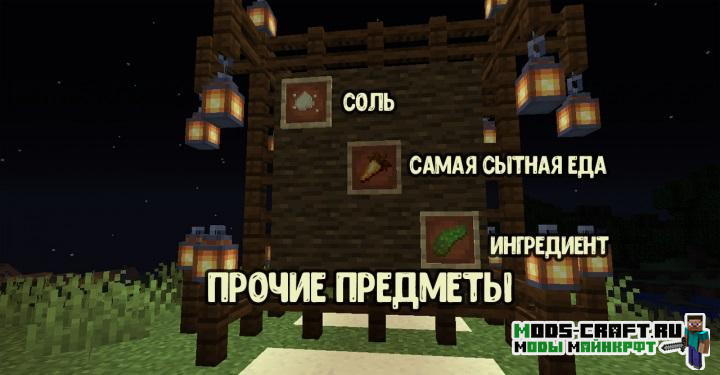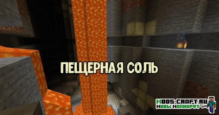 Мод добавляет в игру морскую и пещерную соль, которую можно добавить в еду и повысить её сытость в разы. Найти её можно в мире, она будет генерироваться случайным образом.