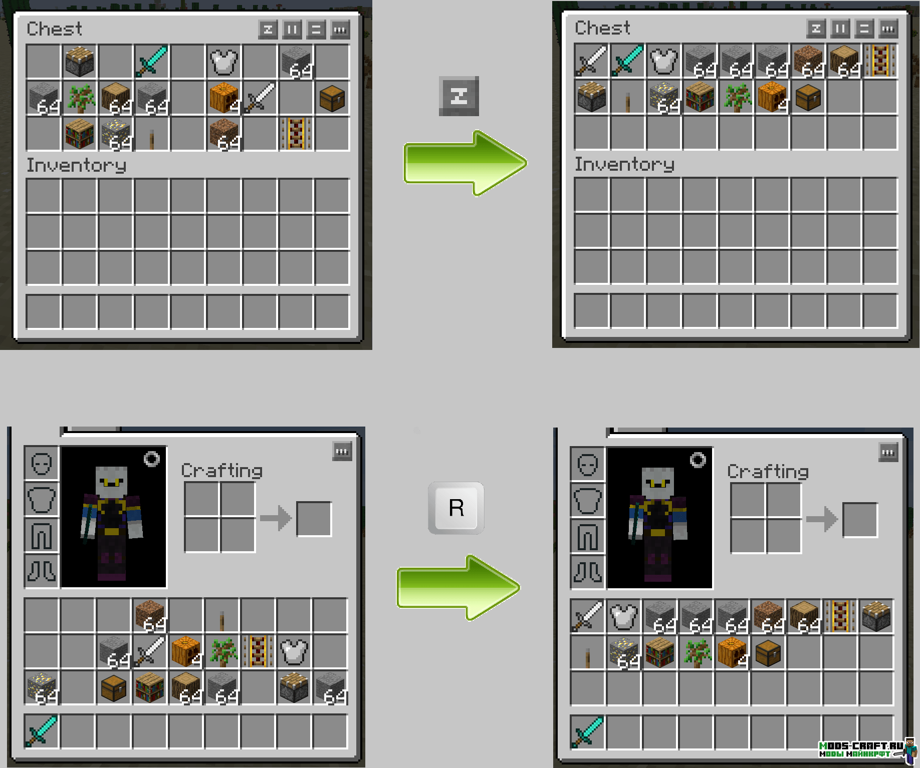 Мод Inventory Tweaks позволит отсортировать автоматически вещи в вашем инвентаре, что довольно удобно и экономит массу времени. Обычную сортировку можно осуществить на клавишу R.