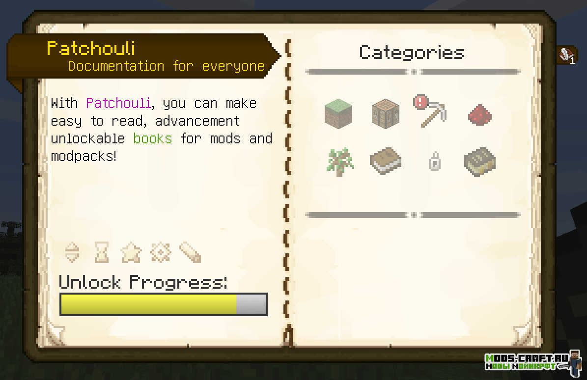 Patchouli добавляет специальную систему создания книги-справочника для модов и модпаков, которая помогает разработчикам описывать свои проекты с помощью внутренних гайдов. С помощью внутриигрового редактора можно создавать страницы книг с красивым форматированием текста, использованием маркеров, ссылок, оглавлений и даже иконок.