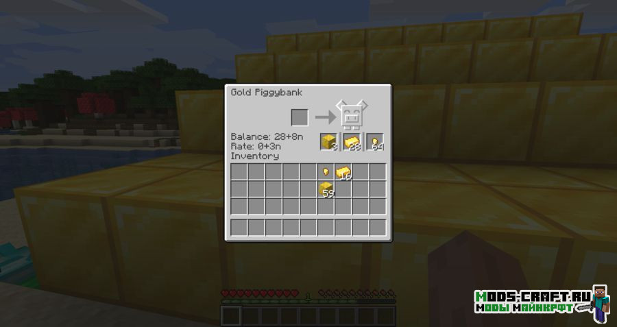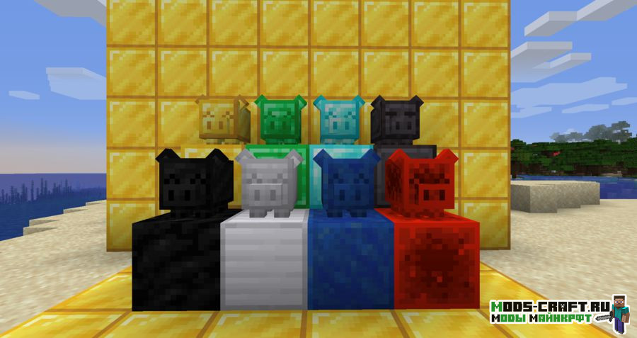 Piggybanks добавит в игру 8 видов копилок в виде свинки, которые могут быть сделаны из угля, железа, красного камня, золота, лазурита, изумруда, алмаза и незерита. Они могут хранить в себе определённые материалы, которые со временем будут накапливаться. Вводить и выводить материалы из копилки вы можете блоками, слитками и самородками.