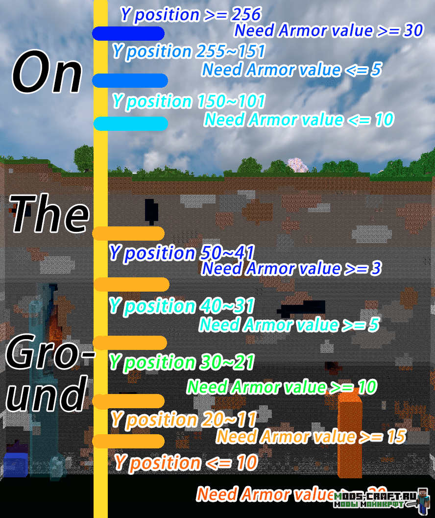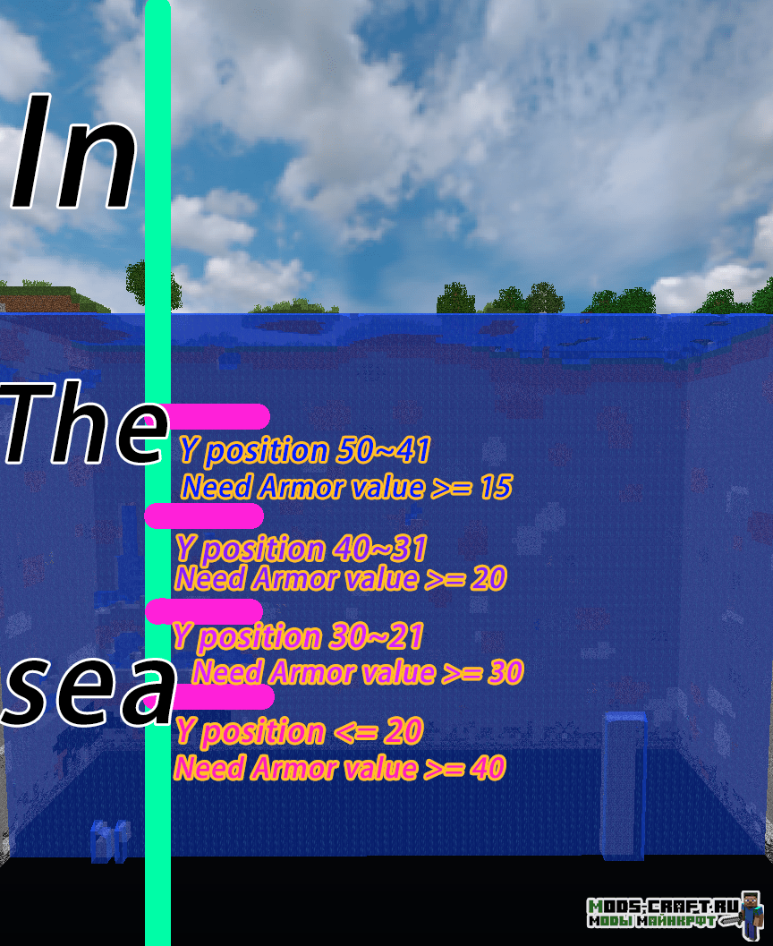 Небольшой реалистичный мод, добавляющий в игру Майнкрафт атмосферное и водяное давление. Как это повлияет на игрока? очень просто — забираясь на вершины или спускаясь в глубокие шахты, игрок будет чувствовать дискомфорт, т.к. давление изменится. При погружении в воду необходимо надевать усиленную и прочную броню, ведь на нас будет воздействовать водяное давление.