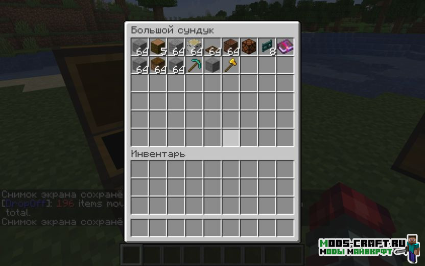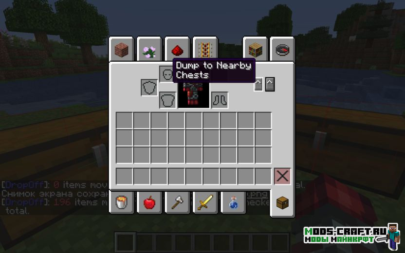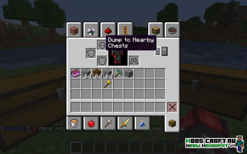 Quickstack — это мод, который добавляет две новые кнопки в интерфейс инвентаря подобно функциональности террарии. Первая кнопка будет осуществлять быстрый перенос предметов из инвентаря игрока в ближайшее хранилище. А вторая кнопка будет переносить предметы в соседние сундуки только в том случае, если в них уже есть ранее существовавший предмет этого типа, как бы дополняя стаки.