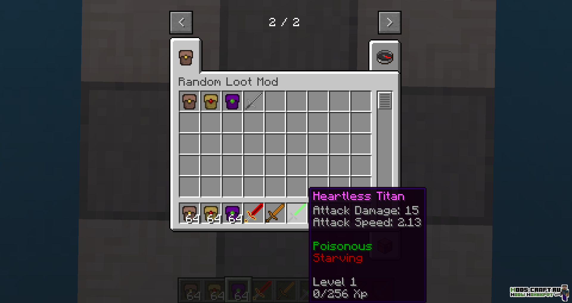 Мод Random Loot добавляет три вида кейсов (базовый, золотой и титановый), из которых будет выпадать оружие и инструменты со случайными характеристиками урона, скорость атаки и эффекты чар. Заполучить такие кейсы можно в подземельях и просто убивая мобов.
