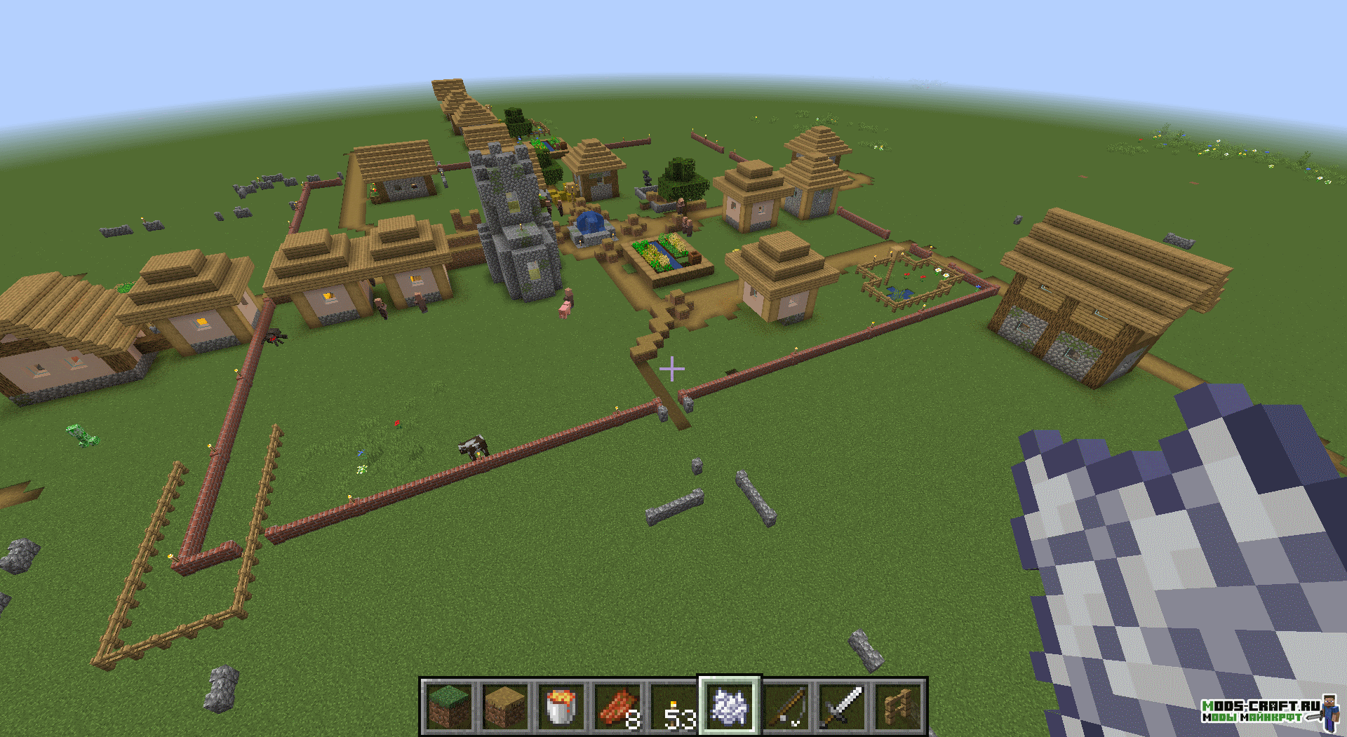 - «p» — строительство личного забора вокруг домов за пределами деревни каменной стеной с с дополнительными факелами.