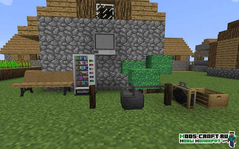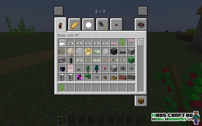 Данный мод создан для Role Play серверов. В игре появится денежная валюта, банкоматы, терминал, торговый автомат, еда, вещи, оружие и другие блоки с данным назначением.