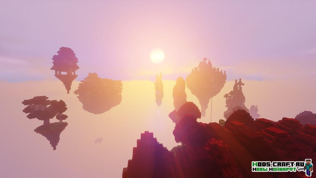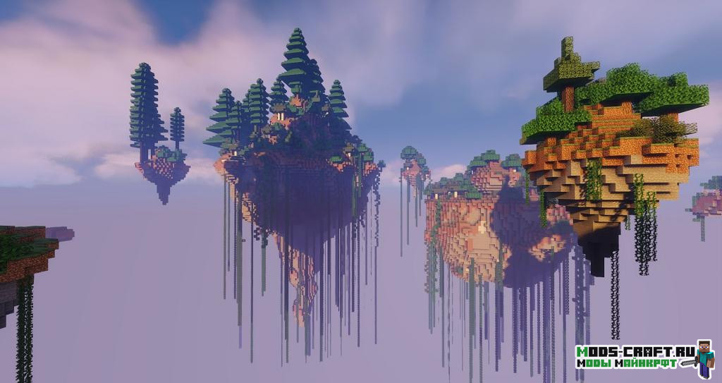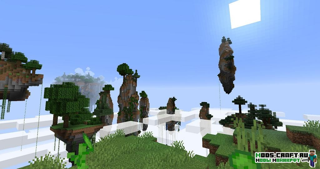 Этот мод добавит новый вид генерации мира — летающие острова, на которых игроку нужно обустраиваться и стараться выживать. Для связи островов, игроку самому необходимо строить мосты из блоков. Не забудьте перед созданием миры указать новый тип генерации, добавляемый модом.