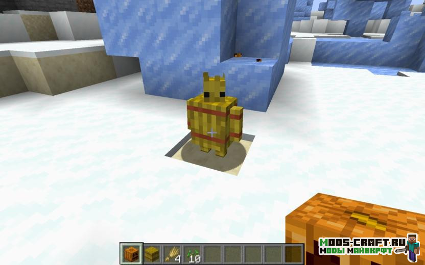 Для создания такого голема необходимо на блока сена положить вырезанную тыкву.