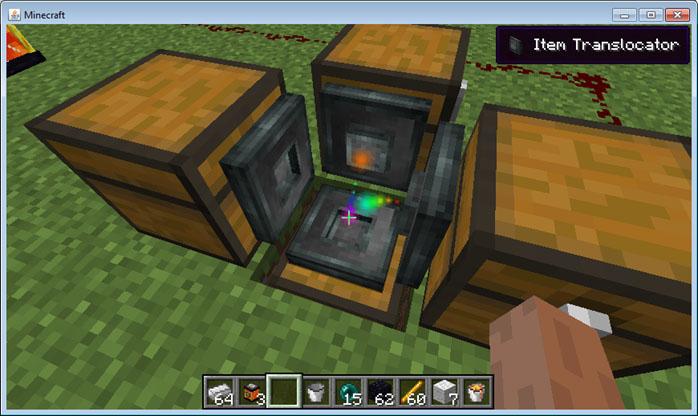 Мод translocators позволит вам создать специальный механизм для передачи предметов и различных блоков в другую точку. Для этого понадобиться передатчик и приёмник, куда будет передаваться содержимое, причём можно всё это отфильтровать, чтобы, например, булыжник остался в сундуке.