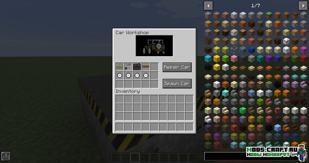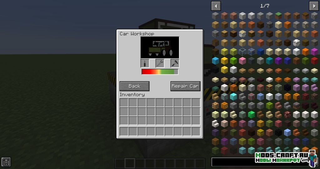 Чтобы построить автосервис вам необходимо установить 1 блок car workshop и поставить 8 блоков car workshop parts вокруг него. После этого нажмите ПКМ на получившуюся постройку и тем самым вы попадёте в интерфейс сервиса. Тут вы можете создавать и ремонтировать машины от повреждений.