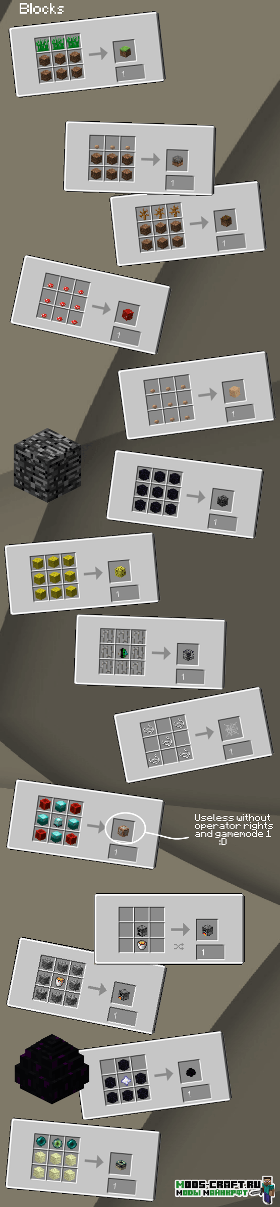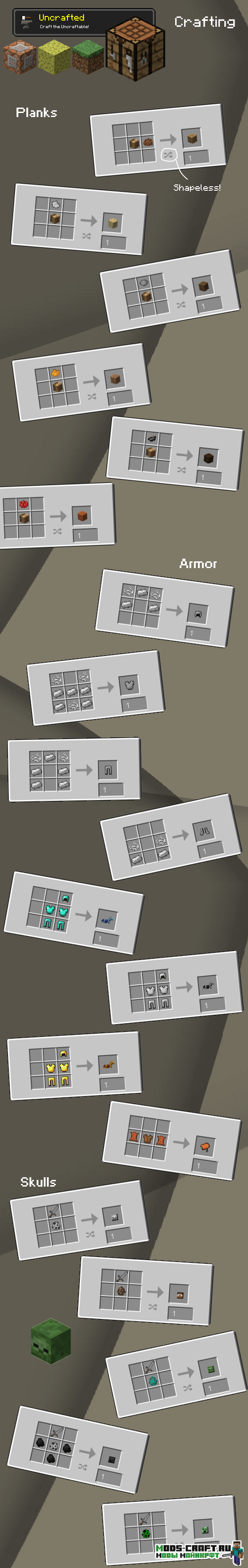 Многие задумывались над вопросом «Почему нет рецептов крафта некоторых вещей в майнкрафт?» Ответ и решение Вам даст мод Uncrafted, который добавит крафты на предметы, ранее которые нельзя было скрафтить. Это очень полезно и расширяет ванильную версию игры, делая её более познавательной и не такой скучной.